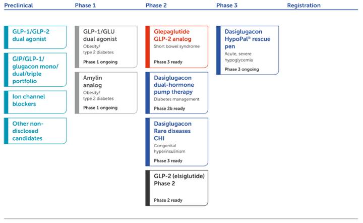 Zealands pipeline consists of two frontrunner programs: glepaglutide, a long-acting GLP-2 analog in development for the treatment of short bowel syndrome, and dasiglucagon, a liquid formulated glucagon analog in development as three distinct medicines.