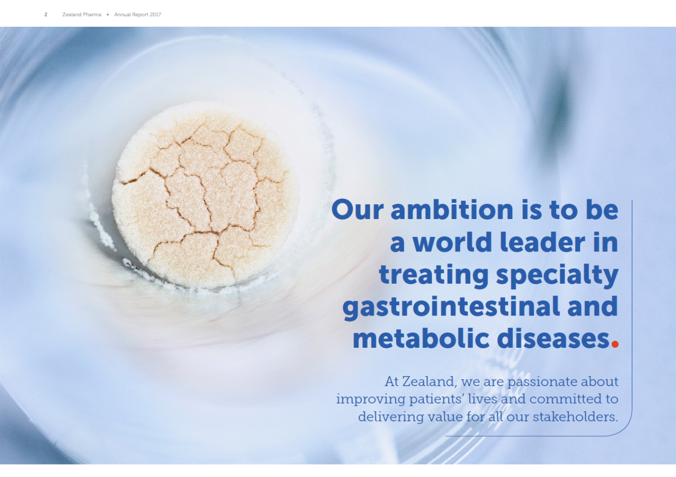 2 Zealand Pharma Annual Report 2017 Our ambition is to be a world leader in treating specialty gastrointestinal and metabolic diseases At Zealand, we are passionate about improving patients lives and committed to delivering value for all our stakeholders.