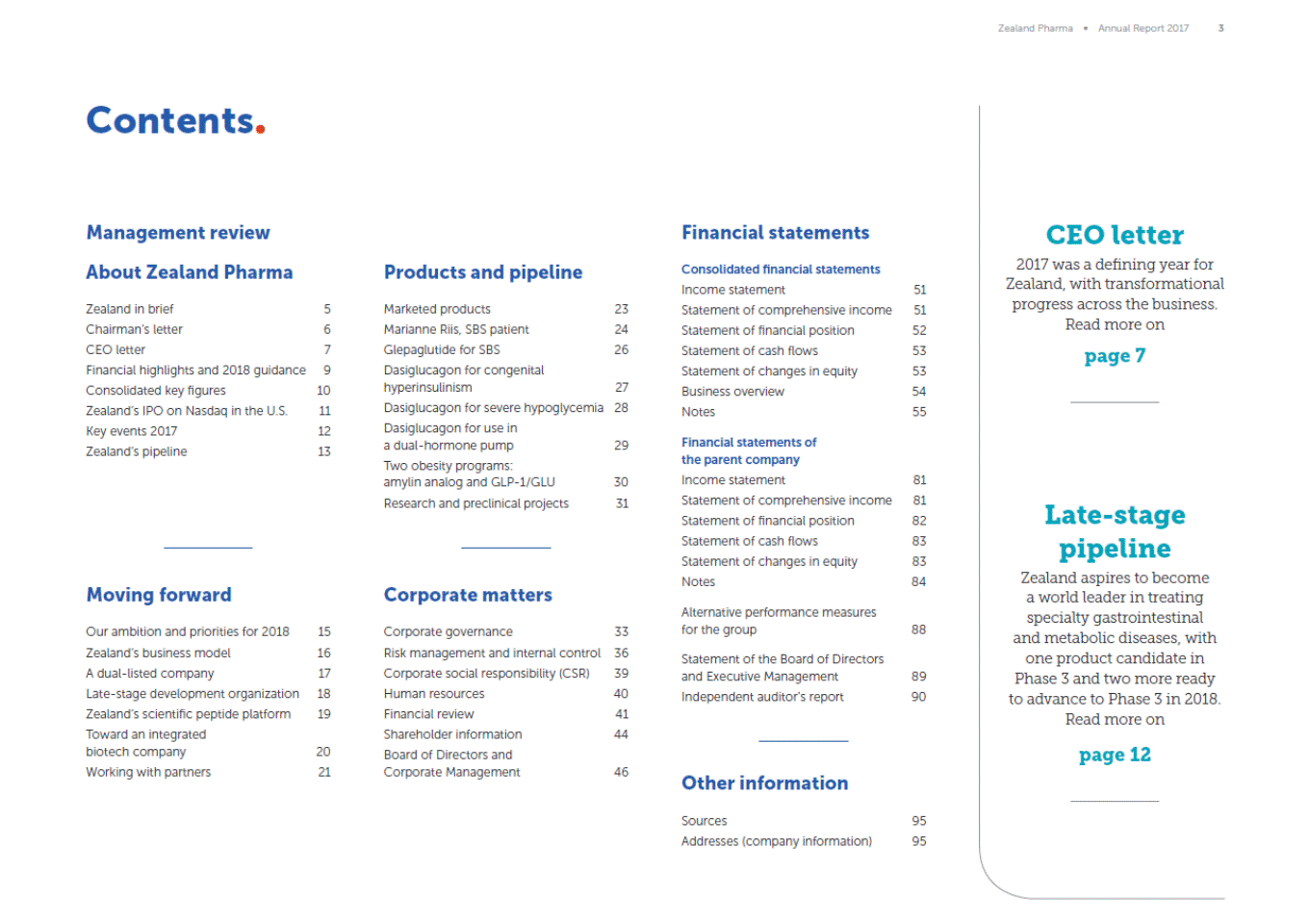 Zealand Pharma Annual Report 2017 3 Contents Management review Financial statements CEO letter 2017 was a defining year for Zealand, with transformational progress across the business. Read more on page 7 About Zealand Pharma Products and pipeline Consolidated financial statements Income statement Statement of comprehensive income Statement of financial position Statement of cash flows Statement of changes in equity Business overview Notes 51 51 52 53 53 54 55 Zealand in brief Chairmans letter CEO letter Financial highlights and 2018 guidance Consolidated key figures Zealands IPO on Nasdaq in the U.S. Key events 2017 Zealands pipeline 5 6 7 9 10 11 12 13 Marketed products Marianne Riis, SBS patient Glepaglutide for SBS Dasiglucagon for congenital hyperinsulinism Dasiglucagon for severe hypoglycemia Dasiglucagon for type 1 diabetes care Two obesity programs: amylin analog and GLP-1/GLU Research and preclinical projects 23 24 26 27 28 29 Parent company financial statements Income statement Statement of comprehensive income Statement of financial position Statement of cash flows Statement of changes in equity Notes 81 81 82 83 83 84 30 31 Late-stage pipeline Zealand aspires to become a world leader in treatning specialty gastrointestinal and metabolic diseases with one product candidate in Phase 3 and two more ready to advance to Phase 3 in 2018. Read more on Alternative Performance Measures 88 Moving forward Corporate matters Statement of the Board of Directors and Executive Management Independent auditors report 89 90 Our long-term ambition and priorities for 2018 Zealands business model A dual-listed company Late-stage development organization Corporate governance Risk management and internal control Corporate social responsibility (CSR) Human resources Financial review Shareholder information Board of Directors and Corporate Management 33 36 39 40 41 44 15 16 17 18 Other information page 12 Toward an integrated biotech company 19 Zealands scientific peptide platform Working with partnerships 20 21 Sources Addresses (company information) 95 95 46