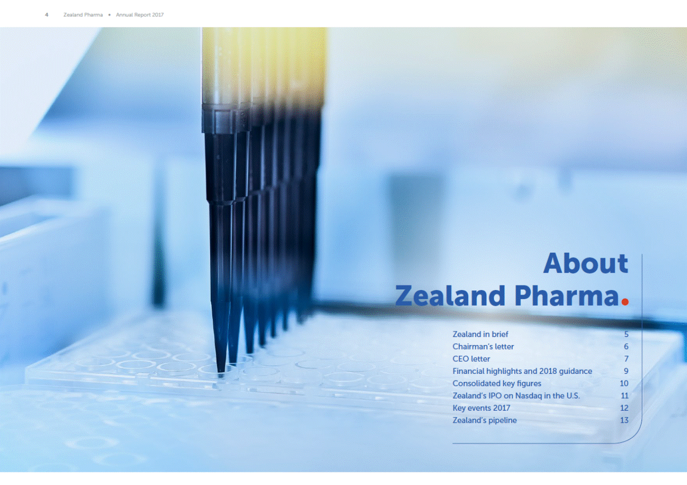4 Zealand Pharma Annual Report 2017 About Zealand Pharma Zealand in brief Chairmans letter CEO letter Financial highlights and 2018 guidance Consolidated key figures Zealands IPO on Nasdaq in the U.S. Key events 2017 Zealands pipeline 5 6 7 9 10 11 12 13
