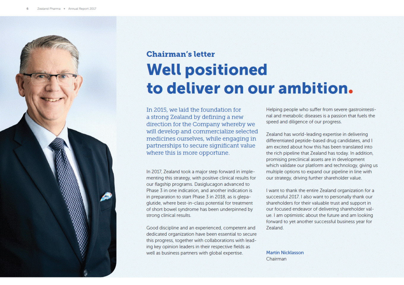 6 Zealand Pharma Annual Report 2017 Chairmans letter Well positioned to deliver on In 2015, we laid the foundation for a strong Zealand by defining a new our ambition Helping people who suffer from severe gastrointesti-nal and metabolic diseases is a passion that fuels the speed and diligence of our progress. direction for the Company whereby we will develop and commercialize selected medicines ourselves, while engaging in partnerships to secure significant value where this is more opportune. Zealand has world-leading expertise in delivering differentiated peptide-based drug candidates, and I am excited about how this has been translated into the rich pipeline that Zealand has today. In addition promising preclinical assets are in development which validate our platform and technology, giving us multiple options to expand our pipeline in line with our strategy, driving further shareholder value. In 2017, Zealand took a major step forward in imple-menting this strategy, with positive clinical results for our flagship programs. Dasiglucagon advanced to Phase 3 in one indication, and another indication is in preparation to start Phase 3 in 2018, as is glepa-glutide, where best-in-class potential for treatment of short bowel syndrome has been underpinned by strong clinical results. I want to thank the entire Zealand organization for a successful 2017. I also want to personally thank our shareholders for their valuable trust and support in our focused endeavor of delivering shareholder val-ue. I am optimistic about the future and am looking forward to yet another successful business year for Zealand. Good discipline and an experienced, competent and dedicated organization have been essential to secure this progress, together with collaborations with lead-ing key opinion leaders in their respective fields as well as business partners with global expertise. Martin Nicklasson Chairman