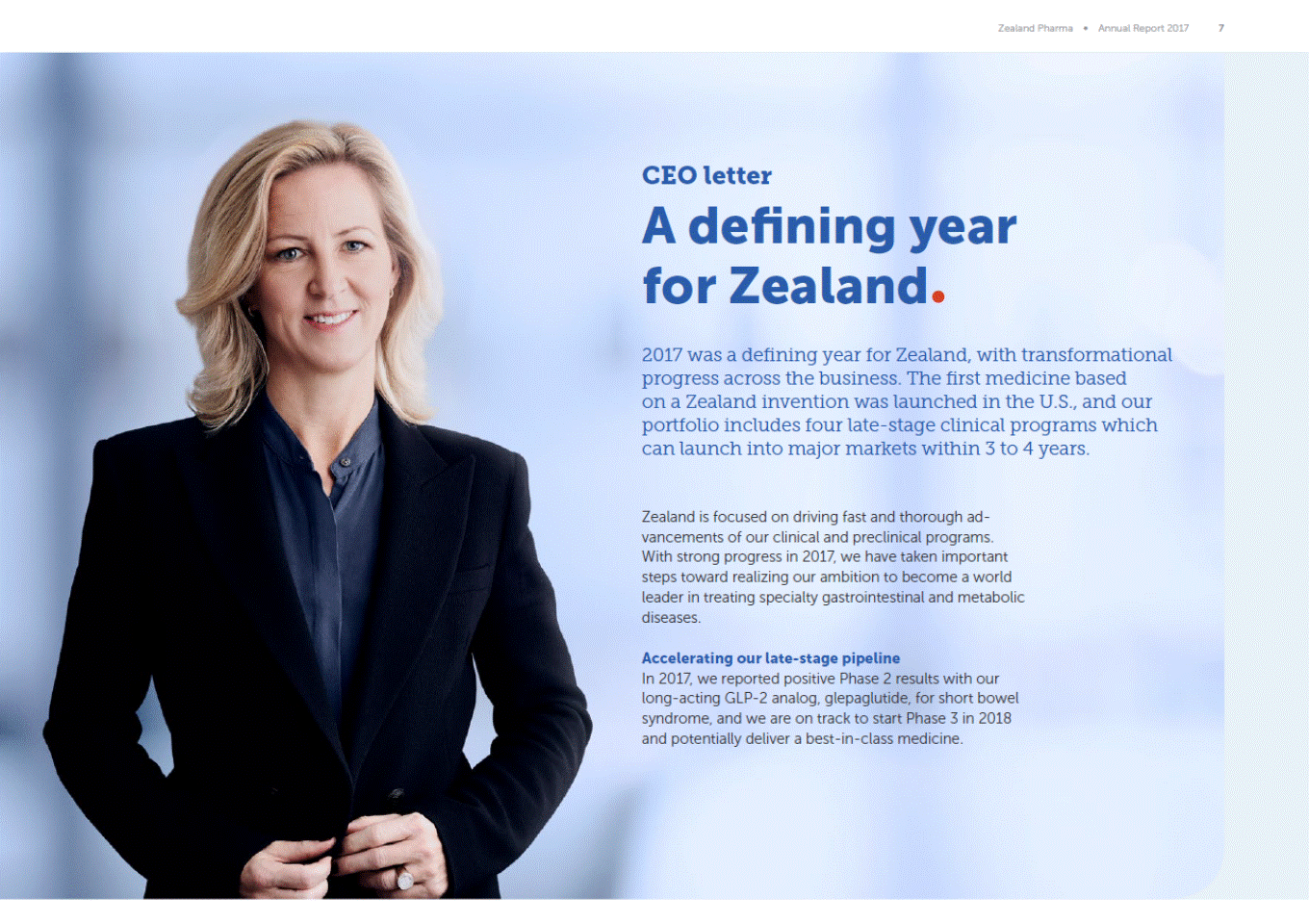 Zealand Pharma Annual Report 2017 7 CEO letter A defining year for Zealand 2017 was a defining year for Zealand, with transformational progress across the business. The first medicine based on a Zealand invention was launched in the U.S., and our portfolio includes four late-stage clinical programs which can launch into major markets within 3 to 4 years. Zealand is focused on driving fast and thorough ad-vancements of our clinical and preclinical programs. With strong progress in 2017, we have taken important steps toward realizing our ambition to become a world leader in treating specialty gastrointestinal and metabolic diseases. Accelerating our late-stage pipeline In 2017, we reported positive Phase 2 results with our long-acting GLP-2 analog, glepaglutide, for short bowel syndrome, and we are on track to start Phase 3 in 2018 and potentially deliver a best-in-class medicine.