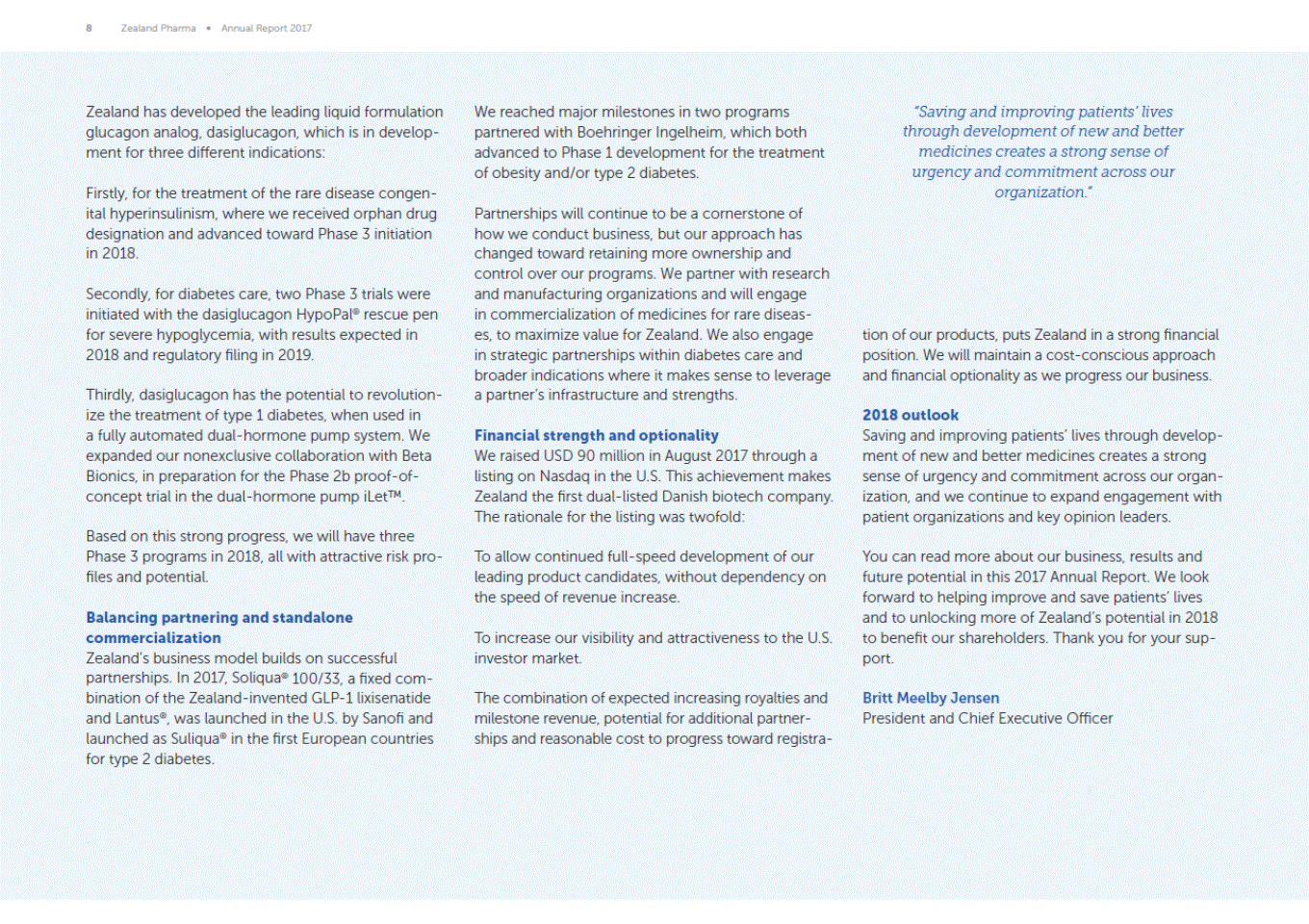 8 Zealand Pharma Annual Report 2017 Saving and improving patients lives through development of new and better medicines creates a strong sense of urgency and commitment across our organization. Zealand has developed the leading liquid formulation glucagon analog, dasiglucagon, which is in develop-ment for three different indications: We reached major milestones in two programs partnered with Boehringer Ingelheim, which both advanced to Phase 1 development for the treatment of obesity and/or type 2 diabetes. Firstly, for the treatment of the rare disease congen-ital hyperinsulinism, where we received orphan drug designation and advanced toward Phase 3 initiation in 2018. Partnerships will continue to be a cornerstone of how we conduct business, but our approach has changed toward retaining more ownership and control over our programs. We partner with research and manufacturing organizations and will engage in commercialization of medicines for rare diseas-es, to maximize value for Zealand. We also engage in strategic partnerships within diabetes care and broader indications where it makes sense to leverage a partners infrastructure and strengths. Secondly, for diabetes care, two Phase 3 trials were initiated with the dasiglucagon HypoPal® rescue pen for severe hypoglycemia, with results expected in 2018 and regulatory filing in 2019. tion of our products, puts Zealand in a strong financial position. We will maintain a cost-conscious approach and financial optionality as we progress our business. Thirdly, dasiglucagon has the potential to revolution-ize the treatment of type 1 diabetes, when used in a fully automated dual-hormone pump system. We expanded our nonexclusive collaboration with Beta Bionics, in preparation for the Phase 2b proof-of-concept trial in the dual-hormone pump iLet. 2018 outlook Saving and improving patients lives through develop-ment of new and better medicines creates a strong sense of urgency and commitment across our organ-ization, and we continue to expand engagement with patient organizations and key opinion leaders. Financial strength and optionality We raised USD 90 million in August 2017 through a listing on Nasdaq in the U.S. This achievement makes Zealand the first dual-listed Danish biotech company. The rationale for the listing was twofold: Based on this strong progress, we will have three Phase 3 programs in 2018, all with attractive risk pro-files and potential. To allow continued full-speed development of our leading product candidates, without dependency on the speed of revenue increase. You can read more about our business, results and future potential in this 2017 Annual Report. We look forward to helping improve and save patients lives and to unlocking more of Zealands potential in 2018 to benefit our shareholders. Thank you for your sup-port. Balancing partnering and standalone commercialization Zealands business model builds on successful partnerships. In 2017, Soliqua® 100/33, a fixed com-bination of the Zealand-invented GLP-1 lixisenatide with Lantus®, was launched in the U.S. by Sanofi and launched as Suliqua® in the first European countries for type 2 diabetes. To increase our visibility and attractiveness to the U.S. investor market. Britt Meelby Jensen President and Chief Executive Officer The combination of expected increasing royalties and milestone revenue, potential for additional partner-ships and reasonable cost to progress toward registra-