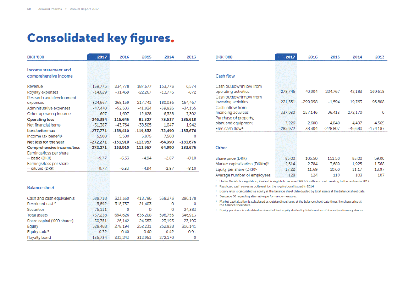 10 Zealand Pharma Annual Report 2017 Consolidated key figures DKK 000 2017 2016 2015 2014 2013 DKK 000 2017 2016 2015 2014 2013 Income statement and comprehensive income Cash flow Revenue Royalty expenses Research and development expenses Administrative expenses Other operating income Operating loss Net financial items Loss before tax Income tax benefit1 Net loss for the year Comprehensive income/loss Earnings/loss per share basic (DKK) Earnings/loss per share diluted (DKK) 139,775 -14,629 234,778 -31,459 187,677 -22,267 153,773 -13,776 6,574 -872 Cash outflow/inflow from operating activities Cash outflow/inflow from investing activities Cash inflow from financing activities Purchase of property, plant and equipment Free cash flow4 -278,746 40,904 -224,767 -42,183 -169,618 221,351 -299,958 -1,594 19,763 96,808 -324,667 -47,470 607 -246,384 -31,387 -277,771 5,500 -272,271 -272,271 -268,159 -52,503 1,697 -115,646 -43,764 -159,410 5,500 -153,910 -153,910 -217,741 -41,824 12,828 -81,327 -38,505 -119,832 5,875 -113,957 -113,957 -180,036 -39,826 6,328 -73,537 1,047 -72,490 7,500 -64,990 -64,990 -164,467 -34,155 7,302 -185,618 1,942 -183,676 0 -183,676 -183,676 337,930 157,146 96,413 272,170 0 -7,226 -285,972 -2,600 38,304 -4,040 -228,807 -4,497 -46,680 -4,569 -174,187 Other -9.77 -6.33 -4.94 -2.87 -8.10 Share price (DKK) Market capitalization (DKKm)5 Equity per share (DKK)6 Average number of employees 85.00 2,614 17.22 128 106.50 2,784 11.69 124 151.50 3,689 10.60 110 83.00 1,925 11.17 103 59.00 1,368 13.97 107 -9.77 -6.33 -4.94 -2.87 -8.10 ¹ 2 3 4 5 Under Danish tax legislation, Zealand is eligible to receive DKK 5.5 million in cash relating to the tax loss in 2017. Restricted cash serves as collateral for the royalty bond issued in 2014. Equity ratio is calculated as equity at the balance sheet date divided by total assets at the balance sheet date. Free cash flow is calculated as cash flow from operating activities less purchase of property, plant and equipment. Market capitalization is calculated as outstanding shares at the balance sheet date times the share price at the balance sheet date. Equity per share is calculated as shareholders equity divided by total number of shares less treasury shares. Balance sheet Cash and cash equivalents Restricted cash2 Securities Total assets Share capital (000 shares) Equity Equity ratio3 Royalty bond 588,718 5,892 75,111 737,238 30,751 528,468 0.72 135,734 323,330 318,737 0 694,626 26,142 278,194 0.40 332,243 418,796 21,403 0 636,208 24,353 252,231 0.40 312,951 538,273 0 0 596,756 23,193 252,828 0.42 272,170 286,178 0 24,383 346,913 23,193 316,141 0.91 0 6