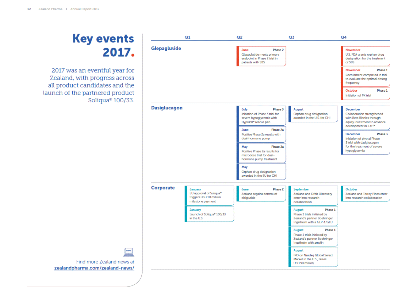 12 Zealand Pharma Annual Report 2017 Key events 2017 2017 was an eventful year for Zealand, with progress across all product candidates and the launch of the partnered product Soliqua® 100/33. Q1 Q2 Q3 Q4 Glepaglutide June Phase 2 November U.S. FDA grants orphan drug designation for the treatment of SBS Glepaglutide meets primary endpoint in Phase 2 trial in patients with SBS November Phase 1 Recruitment completed in trial to evaluate the optimal dosing frequency October Initiation of PK trial Phase 1 Dasiglucagon July Phase 3 August Orphan drug designation awarded in the U.S. for CHI December Collaboration strengthened with Beta Bionics through equity investment to advance development in iLet Initiation of Phase 3 trial for severe hypoglycemia with HypoPal® rescue pen June Phase 2a December Phase 3 Positive Phase 2a results with dual-hormone pump Initiation of pivotal Phase 3 trial with dasiglucagon for the treatment of severe hypoglycemia May Phase 2a Positive Phase 2a results for microdose trial for dual-hormone pump treatment May Orphan drug designation awarded in the EU for CHI Corporate January EU approval of Suliqua® triggers USD 10 million milestone payment June Phase 2 September Zealand and Orbit Discovery enter into research collaboration October Zealand and Torrey Pines enter into research collaboration Zealand regains control of elsiglutide January Launch of Soliqua® 100/33 in the U.S. August Phase 1 Phase 1 trials initiated by Zealands partner Boehringer Ingelheim with a GLP-1/GLU August Phase 1 Phase 1 trials initiated by Zealands partner Boehringer Ingelheim with amylin August IPO on Nasdaq Global Select Market in the U.S., raises USD 90 million Find more Zealand news at zealandpharma.com/zealand-news/