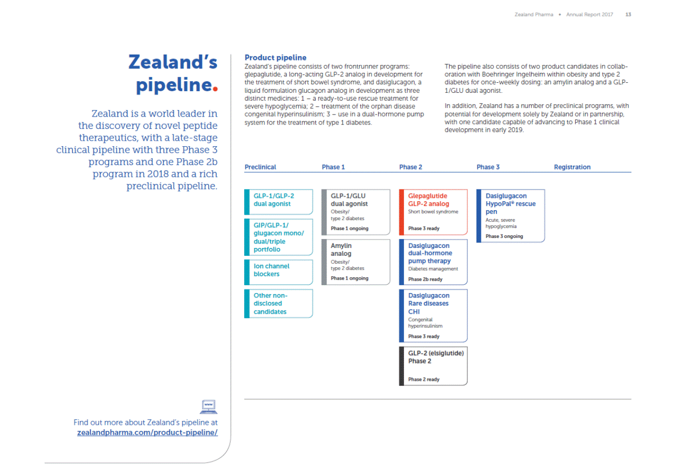 Zealand Pharma Annual Report 2017 5 Zealand in brief Zealand is a late-stage biotech company with new products launching into major markets within 3 to 4 years. Zealand We are a world leader in the discovery and development of peptide therapeutics, focusing on specialty gastrointestinal and metabolic diseases. Programs Accelerating late-stage clinical programs with glepaglutide and three dasiglucagon product candidates as significant short-and long-term value drivers. We aim to advance medicines for rare diseases all the way to market to meet patients needs, while we continue to grow through valuable partnerships in diabetes care. We have a late-stage program in Phase 3 development and two Phase 3-ready programs, all with potential to launch into major markets: glepaglutide, a long-acting GLP-2 analog for short bowel syndrome, and dasiglucagon, a soluble, stable glucagon analog in liquid formulation in development as three distinct clinical programs. Peptides A world leading peptide platform with product candidates for near-term pipeline expansion. We have a license agreement with Sanofi covering two marketed products. In 2017, Sanofi launched Soliqua® 100/33, a fixed-dose combination of the Zealand-invented GLP-1 lixisenatide with Lantus®, in the U.S. followed by a launch as Suliqua® in several European countries. We continue to leverage our validated peptide platform and have multiple opportunities for near-term pipeline expansion. Financial strength Financial strength with increasing royalty revenue from commercial products and partnerships. Find out more about Zealand on zealandpharma.com
