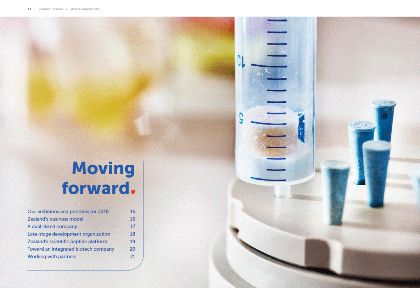 (\ Moving forward. Our ambitions and priorities for 2018 Zealand's business model A dual-ilsted company Late-stage development organization Zealand's scientific peptide platform Toward an integrated biotech company Working with partners 15 16 17 18 19 20 21 1·1