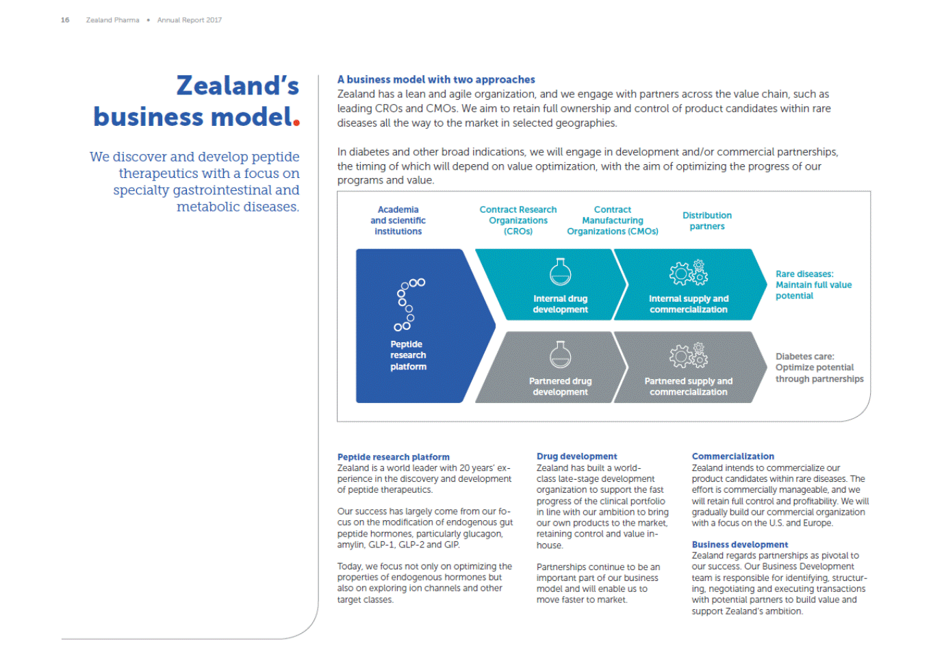 16 Zealand Pharma Annual Report 2017 Zealands business model We discover and develop peptide therapeutics with a focus on specialty gastrointestinal and metabolic diseases. A business model with two approaches Zealand has a lean and agile organization, and we engage with partners across the value chain, such as leading CROs and CMOs. We aim to retain full ownership and control of product candidates within rare diseases all the way to the market in selected geographies. In diabetes and other broad indications, we will engage in development and/or commercial partnerships, the timing of which will depend on value optimization, with the aim of optimizing the progress of our programs and value. Academia and scientific institutions Contract Research Organizations (CROs) Contract Manufacturing Organizations (CMOs) Distribution partners Rare diseases: Maintain full value potential Internal drug development Internal supply and commercialization Peptide research platform Diabetes care: Optimize potential through partnerships Partnered drug development Partnered supply and commercialization Peptide research platform Zealand is a world leader with 20 years ex-perience in the discovery and development of peptide therapeutics. Drug development Zealand has built a world-class late-stage development organization to support the fast progress of the clinical portfolio in line with our ambition to bring our own products to the market, retaining control and value in-house. Commercialization Zealand intends to commercialize our product candidates within rare diseases. The effort is commercially manageable, and we will retain full control and profitability. We will gradually build our commercial organization with a focus on the U.S. and Europe. Our success has largely come from our fo-cus on the modification of endogenous gut peptide hormones, particularly glucagon, amylin, GLP-1, GLP-2 and GIP. Business development Zealand regards partnerships as pivotal to our success. Our Business Development team is responsible for identifying, structur-ing, negotiating and executing transactions with potential partners to build value and support Zealands ambition. Today, we focus not only on optimizing the properties of endogenous hormones but also on exploring ion channels and other target classes. Partnerships continue to be an important part of our business model and will enable us to move faster to market.