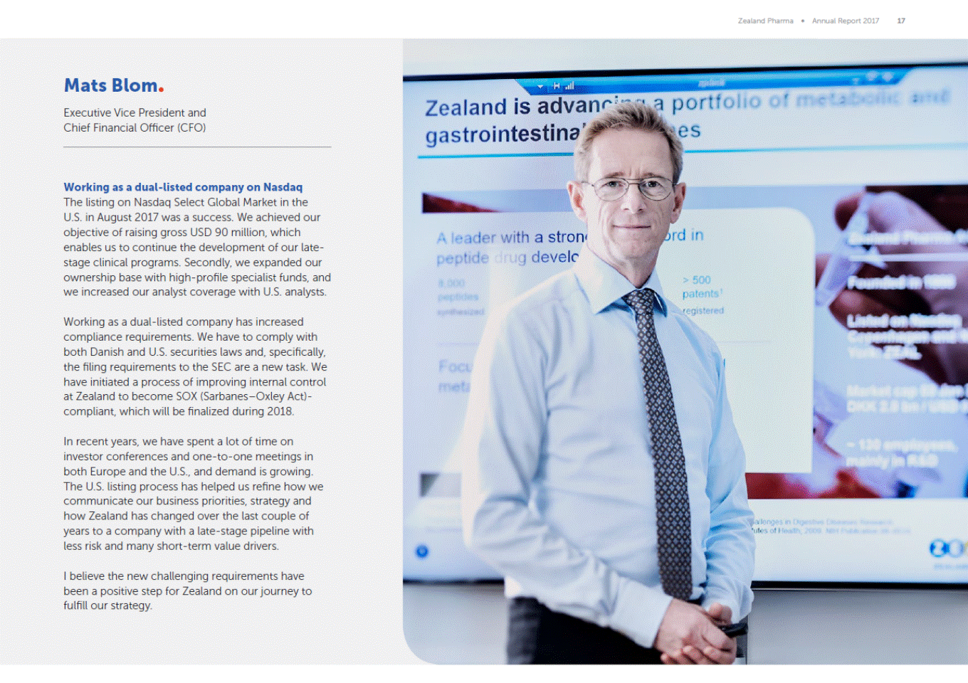Zealand Pharma Annual Report 2017 17 Mats Blom Executive Vice President and Chief Financial Officer (CFO) Working as a dual-listed company on Nasdaq The listing on Nasdaq Select Global Market in the U.S. in August 2017 was a success. We achieved our objective of raising gross USD 90 million, which enables us to continue the development of our late-stage clinical programs. Secondly, we expanded our ownership base with high-profile specialist funds, and we increased our analyst coverage with U.S. analysts. Working as a dual-listed company has increased compliance requirements. We have to comply with both Danish and U.S. securities laws and, specifically, the filing requirements to the SEC are a new task. We have initiated a process of improving internal control at Zealand to become SOX (SarbanesOxley Act)-compliant, which will be finalized during 2018. In recent years, we have spent a lot of time on investor conferences and one-to-one meetings in both Europe and the U.S., and demand is growing. The U.S. listing process has helped us refine how we communicate our business priorities, strategy and how Zealand has changed over the last couple of years to a company with a late-stage pipeline with less risk and many short-term value drivers. I believe the new challenging requirements have been a positive step for Zealand on our journey to fulfill our strategy.