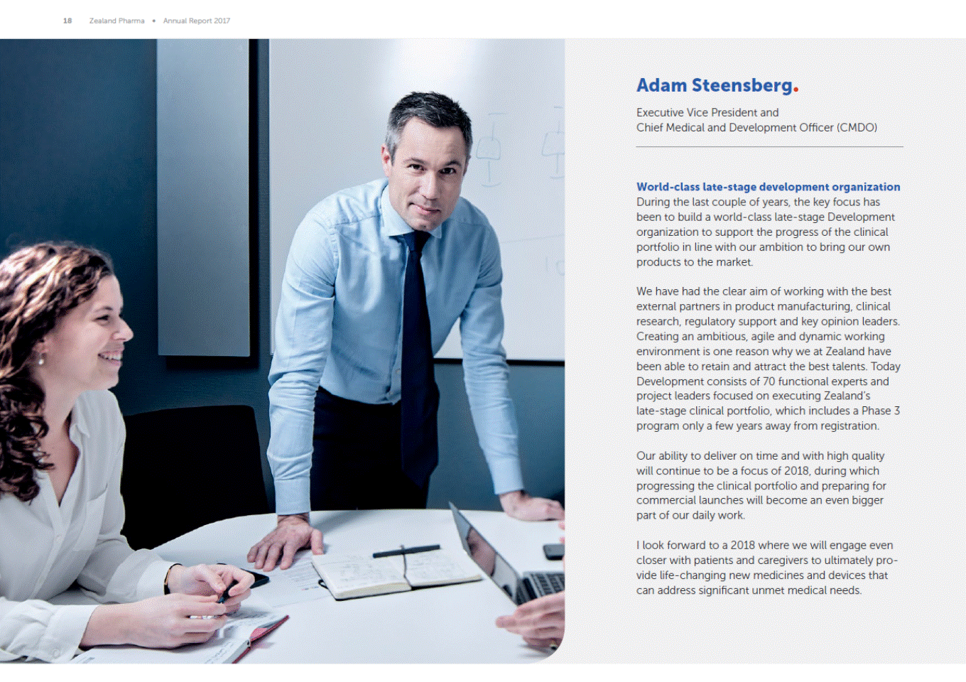 18 Zealand Pharma Annual Report 2017 Adam Steensberg Executive Vice President and Chief Medical and Development Officer (CMDO) World-class late-stage development organization During the last couple of years, the key focus has been to build a world-class late-stage Development organization to support the progress of the clinical portfolio in line with our ambition to bring our own products to the market. We have had the clear aim of working with the best external partners in product manufacturing, clinical research, regulatory support and key opinion leaders. Creating an ambitious, agile and dynamic working environment is one reason why we at Zealand have been able to retain and attract the best talents. Today Development consists of 70 functional experts and project leaders focused on executing Zealands late-stage clinical portfolio, which includes a Phase 3 program only a few years away from registration. Our ability to deliver on time and with high quality will continue to be a focus of 2018, during which progressing the clinical portfolio and preparing for commercial launches will become an even bigger part of our daily work. I look forward to a 2018 where we will engage even closer with patients and caregivers to ultimately pro-vide life-changing new medicines and devices that can address significant unmet medical needs.