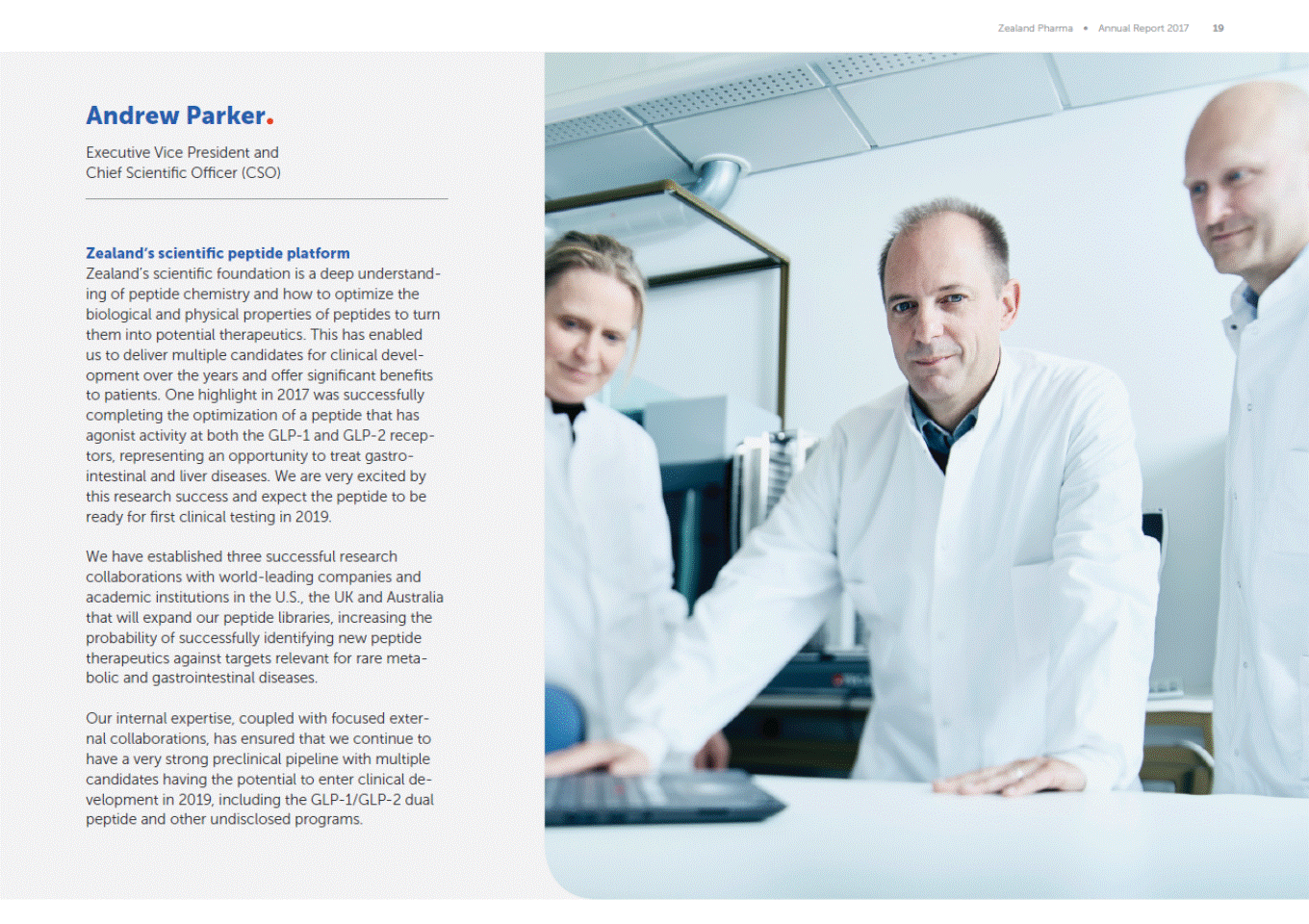 1 Andrew Parker. Executive Vice President and Ch1ef Scientific Officer (CSO) Zealand's scientific peptide platform Zealand's scientific foundation 1s a deep understand ing of peptide chemistry and how to optimize the biological and physicalproperties of peptides to turn them into potential therapeutics. Th1s has enabled us to deliver multiple candidates for clinical devel opment over the years and offer s1gnificant benefits to patients. One highlight in 2017 was successfully completing the optimization of a peptide that has agonist activity at both the GLP-1and GLP-2 recep tors, representing an opportunity to treat gastro intestinal and liver diseases. We are very excited by this research success and expect the peptide to be ready for first clinicaltesting in 2019. We have established three successful research collaborations with world-leading companies and academic institutions in the U.S., the UK and Australia that will expand our peptide libraries, increasing the probability of successfully identifying new peptide therapeutics against targets relevant for rare meta bolic and gastrointestinal diseases. Our internal expertise. coupled with focused exter nal collaborations. has ensured that we continue to have a very strong preclinical pipeline with multiple candidates havmg the potentialto enter clinical de velopment in 2019. including the GLP-1/GLP-2 dual peptide and other undisclosed programs. ·--