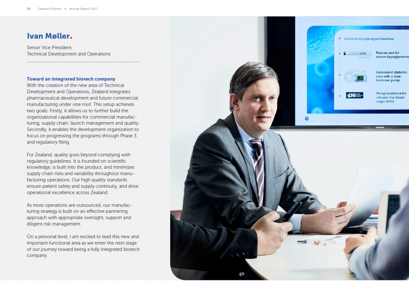 20 Zealand Pharma Annual Report 2017 Ivan Møller Senior Vice President, Technical Development and Operations Toward an integrated biotech company With the creation of the new area of Technical Development and Operations, Zealand integrates pharmaceutical development and future commercial manufacturing under one roof. This setup achieves two goals. Firstly, it allows us to further build the organizational capabilities for commercial manufac-turing, supply chain, launch management and quality. Secondly, it enables the development organization to focus on progressing the programs through Phase 3 and regulatory filing. For Zealand, quality goes beyond complying with regulatory guidelines. It is founded on scientific knowledge, is built into the product, and minimizes supply chain risks and variability throughout manu-facturing operations. Our high quality standards ensure patient safety and supply continuity, and drive operational excellence across Zealand. As most operations are outsourced, our manufac-turing strategy is built on an effective partnering approach with appropriate oversight, support and diligent risk management. On a personal level, I am excited to lead this new and important functional area as we enter the next stage of our journey toward being a fully integrated biotech company.