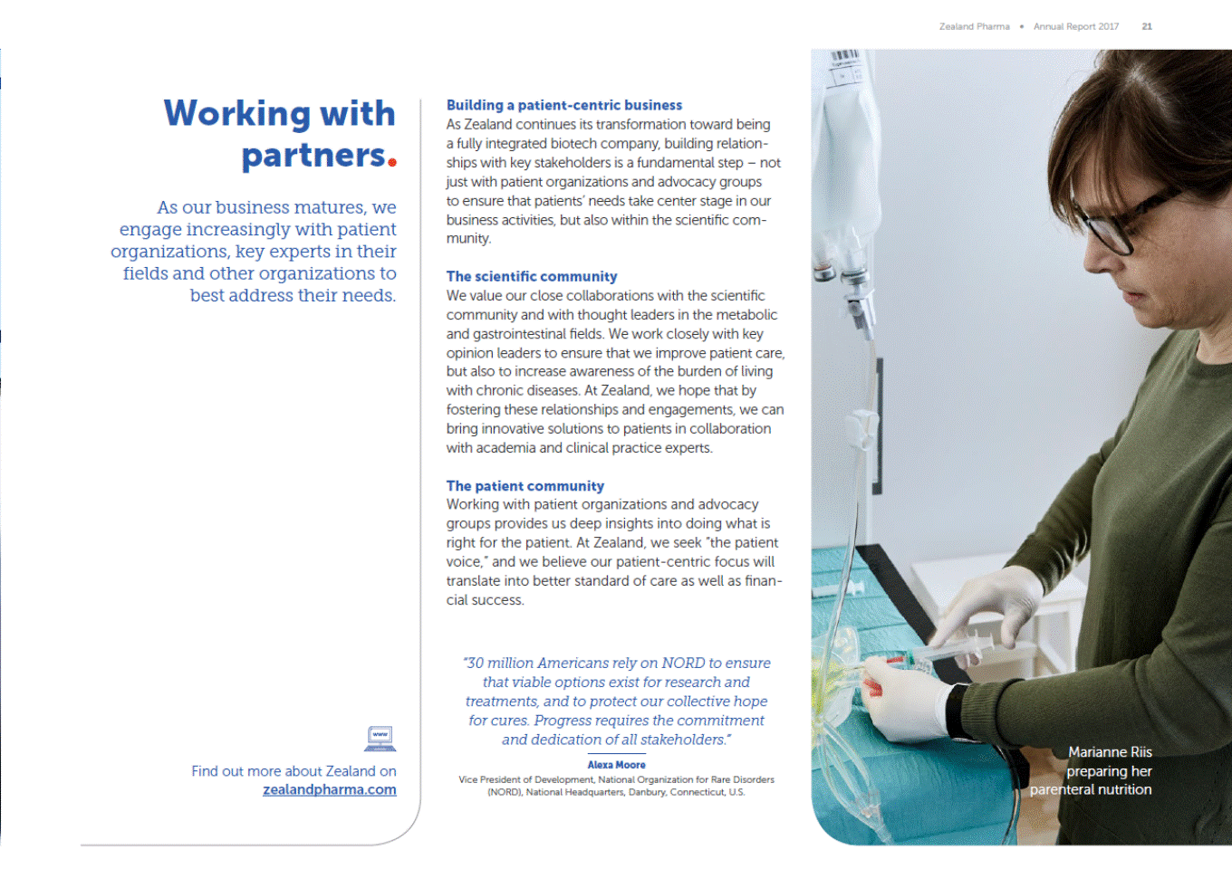Zealand Pharma Annual Report 2017 21 Working with partners As our business matures, we engage increasingly with patient organizations, key experts in their fields and other organizations to best address their needs. Building a patient-centric business As Zealand continues its transformation toward being a fully integrated biotech company, building relation-ships with key stakeholders is a fundamental step not just with patient organizations and advocacy groups to ensure that patients needs take center stage in our business activities, but also within the scientific com-munity. The scientific community We value our close collaborations with the scientific community and with thought leaders in the metabolic and gastrointestinal fields. We work closely with key opinion leaders to ensure that we improve patient care, but also to increase awareness of the burden of living with chronic diseases. At Zealand, we hope that by fostering these relationships and engagements, we can bring innovative solutions to patients in collaboration with academia and clinical practice experts. The patient community Working with patient organizations and advocacy groups provides us deep insights into doing what is right for the patient. At Zealand, we seek the patient voice, and we believe our patient-centric focus will translate into better standard of care as well as finan-cial success. 30 million Americans rely on NORD to ensure that viable options exist for research and treatments, and to protect our collective hope for cures. Progress requires the commitment and dedication of all stakeholders. Marianne Riis preparing her parenteral nutrition Alexa Moore Vice President of Development, National Organization for Rare Disorders (NORD), National Headquarters, Danbury, Connecticut, U.S. Find out more about Zealand on zealandpharma.com