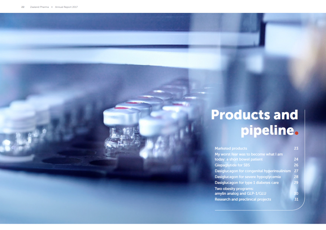 22 Zealand Pharma Annual Report 2017 Products and pipeline Marketed products My worst fear was to become what I am today: a short bowel patient Glepaglutide for SBS Dasiglucagon for congenital hyperinsulinism Dasiglucagon for severe hypoglycemia Dasiglucagon for type 1 diabetes care Two obesity programs: amylin analog and GLP-1/GLU Research and preclinical projects 23 24 26 27 28 29 30 31