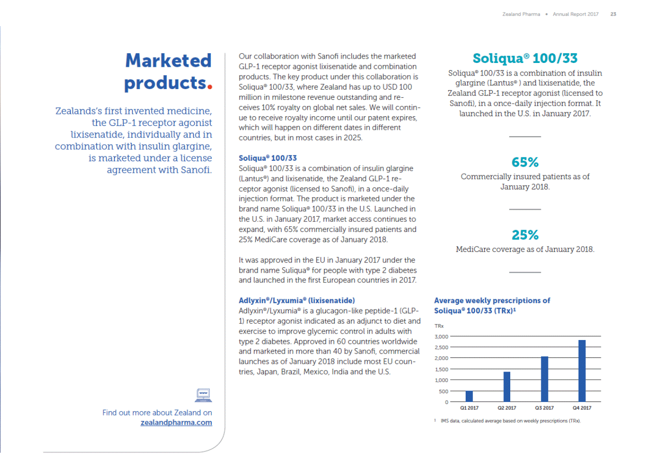 Zealand Pharma Annual Report 2017 23 Marketed products Zealandss first invented medicine, the GLP-1 receptor agonist lixisenatide, individually and in combination with insulin glargine, is marketed under a license agreement with Sanofi. Soliqua® 100/33 Soliqua® 100/33 is a combination of insulin glargine (Lantus® ) and lixisenatide, the Zealand GLP-1 receptor agonist (licensed to Sanofi), in a once-daily injection format. It launched in the U.S. in January 2017. Our collaboration with Sanofi includes the marketed GLP-1 receptor agonist lixisenatide and combination products. The key product under this collaboration is Soliqua® 100/33, where Zealand has up to USD 100 million in milestone revenue outstanding and re-ceives 10% royalty on global net sales. We will contin-ue to receive royalty income until our patent expires, which will happen on different dates in different countries, but is in most cases in 2025. Soliqua® 100/33 Soliqua® 100/33 is a combination of insulin glargine (Lantus®) and lixisenatide, the Zealand GLP-1 re-ceptor agonist (licensed to Sanofi), in a once-daily injection format. The product is marketed under the brand name Soliqua® 100/33 in the U.S. Launched in the U.S. in January 2017, market access continues to expand, with 65% commercially insured patients and 25% MediCare coverage as of January 2018. 65% Commercially insured patients as of January 2018. 25% MediCare coverage as of January 2018. It was approved in the EU in January 2017 under the brand name Suliqua® for people with type 2 diabetes and launched in the first European countries in 2017. Adlyxin®/Lyxumia® (lixisenatide) Adlyxin®/Lyxumia® is a glucagon-like peptide-1 (GLP-1) receptor agonist indicated as an adjunct to diet and exercise to improve glycemic control in adults with type 2 diabetes. Approved in 60 countries worldwide and marketed in more than 40 by Sanofi, commercial launches as of January 2018 include most EU coun-tries, Japan, Brazil, Mexico, India and the U.S. Average weekly prescriptions of Soliqua® 100/33 (TRx)1 TRx 3,000 2,500 2,000 1,500 1,000 500 0 Q1 2017 Q2 2017 Q3 2017 Q4 2017 Find out more about Zealand on zealandpharma.com 1 IMS data, calculated average based on weekly prescriptions (TRx).