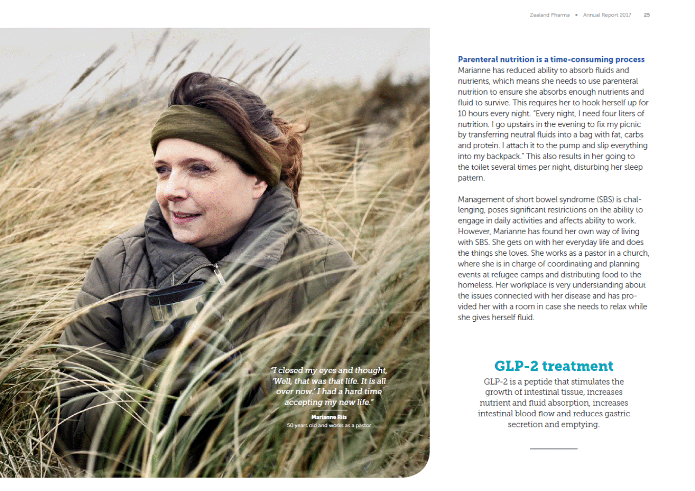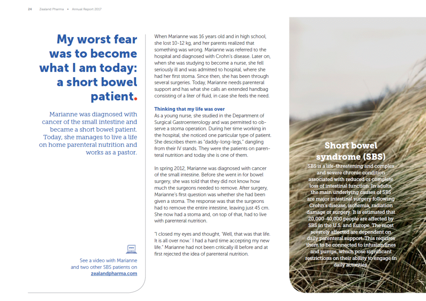 24 Zealand Pharma Annual Report 2017 My worst fear was to become what I am today: a short bowel patient Marianne was diagnosed with cancer of the small intestine and became a short bowel patient. Today, she manages to live a life on home parenteral nutrition and works as a pastor. When Marianne was 16 years old and in high school, she lost 10-12 kg, and her parents realized that something was wrong. Marianne was referred to the hospital and diagnosed with Crohns disease. Later on, when she was studying to become a nurse, she fell seriously ill and was admitted to hospital, where she had her first stoma. Since then, she has been through several surgeries. Today, Marianne needs parenteral support and has what she calls an extended handbag consisting of a liter of fluid, in case she feels the need. Thinking that my life was over As a young nurse, she studied in the Department of Surgical Gastroenterology and was permitted to ob-serve a stoma operation. During her time working in the hospital, she noticed one particular type of patient. She describes them as daddy-long-legs, dangling from their IV stands. They were the patients on paren-teral nutrition and today she is one of them. Short bowel syndrome (SBS) SBS is a life-threatening and complex and severe chronic condition associated with reduced or complete loss of intestinal function. In adults, the main underlying causes of SBS are major intestinal surgery following Crohns disease, ischemia, radiation damage or surgery. It is estimated that 20,000-40,000 people are affected by SBS in the U.S. and Europe. The most severely affected are dependent on daily parenteral support. This requires them to be connected to infusion lines and pumps, which pose significant restrictions on their ability to engage in daily activities. In spring 2012, Marianne was diagnosed with cancer of the small intestine. Before she went in for bowel surgery, she was told that they did not know how much the surgeons needed to remove. After surgery, Mariannes first question was whether she had been given a stoma. The response was that the surgeons had to remove the entire intestine, leaving just 45 cm. She now had a stoma and, on top of that, had to live with parenteral nutrition. I closed my eyes and thought, Well, that was that life. It is all over now. I had a hard time accepting my new life. Marianne had not been critically ill before and at first rejected the idea of parenteral nutrition. See a video with Marianne and two other SBS patients on zealandpharma.com
