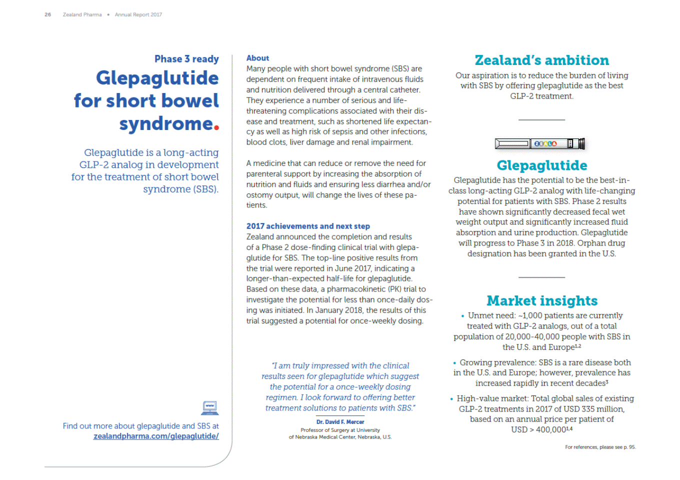 26 Zealand Pharma Annual Report 2017 Phase 3 ready Glepaglutide for short bowel syndrome Glepaglutide is a long-acting GLP-2 analog in development for the treatment of short bowel syndrome (SBS). Zealands ambition Our aspiration is to reduce the burden of living with SBS by offering glepaglutide as the best GLP-2 treatment. About Many people with short bowel syndrome (SBS) are dependent on frequent intake of intravenous fluids and nutrition delivered through a central catheter. They experience a number of serious and life-threatening complications associated with their dis-ease and treatment, such as shortened life expectan-cy as well as high risk of sepsis and other infections, blood clots, liver damage and renal impairment. Glepaglutide Glepaglutide has the potential to be the best-in-class long-acting GLP-2 analog with life-changing potential for patients with SBS. Phase 2 results have shown significantly decreased fecal wet weight output and significantly increased fluid absorption and urine production. Glepaglutide will progress to Phase 3 in 2018. Orphan drug designation has been granted in the U.S. A medicine that can reduce or remove the need for parenteral support by increasing the absorption of nutrition and fluids and ensuring less diarrhea and/or ostomy output, will change the lives of these pa-tients. 2017 achievements and next step Zealand announced the completion and results of a Phase 2 dose-finding clinical trial with glepa-glutide for SBS. The top-line positive results from the trial were reported in June 2017, indicating a longer-than-expected half-life for glepaglutide. Based on these data, a pharmacokinetic (PK) trial to investigate the potential for less than once-daily dos-ing was initiated. In January 2018, the results of this trial suggested a potential for once-weekly dosing. Market insights Unmet need: ~1,000 patients are currently treated with GLP-2 analogs, out of a total population of 20,000-40,000 people with SBS in the U.S. and Europe1,2 Growing prevalence: SBS is a rare disease both in the U.S. and Europe; however, prevalence has increased rapidly in recent decades3 High-value market: Total global sales of existing GLP-2 treatments in 2017 of USD 335 million, based on an annual price per patient of USD > 400,0001,4 I am truly impressed with the clinical results seen for glepaglutide which suggest the potential for a once-weekly dosing regimen. I look forward to offering better treatment solutions to patients with SBS. Dr. David F. Mercer Professor of Surgery at University of Nebraska Medical Center, Nebraska, U.S. Find out more about glepaglutide and SBS at zealandpharma.com/glepaglutide/ For references, please see p. 95. 1 2 3