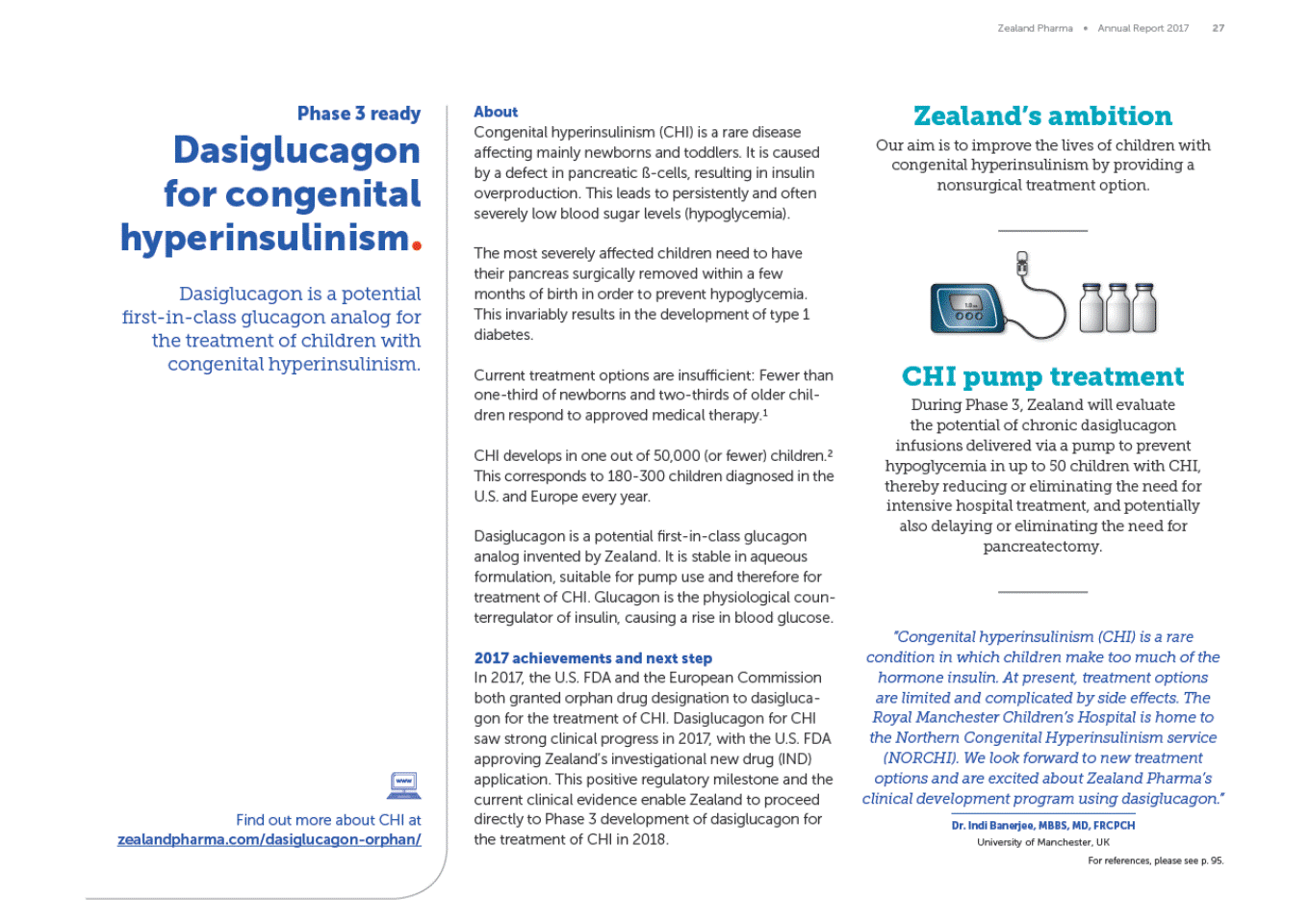 Zealand Pharma Annual Report 2017 27 Phase 3 ready Dasiglucagon for congenital hyperinsulinism Dasiglucagon is a potential first-in-class glucagon analog for the treatment of children with congenital hyperinsulinism. Zealands ambition Our aim is to improve the lives of children with congenital hyperinsulinism by providing a onsurgical treatment option. About Congenital hyperinsulinism (CHI) is a rare disease affecting mainly newborns and toddlers. It is caused by a defect in pancreatic ß-cells, resulting in insulin overproduction. This leads to persistent and often severe low blood sugar levels (hypoglycemia). The most severely affected children need to have their pancreas surgically removed within a few months of birth in order to prevent hypoglycemia. This invariably results in the development of type 1 diabetes. 1.0 U/h CHI pump treatment During Phase 3, Zealand will evaluate the potential of chronic dasiglucagon infusions delivered via a pump to prevent hypoglycemia in up to 50 children with CHI, thereby reducing or eliminating the need for intensive hospital treatment, and potentially also delaying or eliminating the need for pancreatectomy. Current treatment options are insufficient: less than 1/3 of newborns and 2/3 of older children respond to approved medical therapy.1 CHI develops in one out of 50,000 (or fewer) children.2 This corresponds to 180-300 children diagnosed in the U.S. and Europe every year. Dasiglucagon is a potential first-in-class glucagon analog invented by Zealand. It is stable in aqueous formulation, suitable for pump use and therefore for treatment of CHI. Glucagon is the physiological coun-terregulator of insulin, causing a rise in blood glucose. Congenital hyperinsulinism (CHI) is a rare condition in which children make too much of the hormone insulin. At present, treatment options are limited and complicated by side effects. The Royal Manchester Childrens Hospital is home to the Northern Congenital Hyperinsulinism service (NORCHI). We look forward to new treatment options and are excited about Zealand Pharmas clinical development program using dasiglucagon. 2017 achievements and next step In 2017, the U.S. FDA and the European Commission both granted orphan drug designation to dasigluca-gon for the treatment of CHI. Dasiglucagon for CHI saw strong clinical progress in 2017, with the U.S. FDA approving Zealands investigational new drug (IND) application. This positive regulatory milestone and the current clinical evidence enable Zealand to proceed directly to Phase 3 development of dasiglucagon for the treatment of CHI in 2018. Find out more about CHI at zealandpharma.com/dasiglucagon-orphan/ Dr. Indi Banerjee, MBBS, MD, FRCPCH University of Manchester, UK For references, please see p. 95.