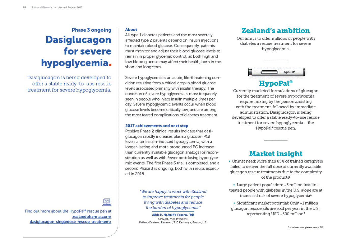 28 Zealand Pharma Annual Report 2017 Phase 3 ongoing Dasiglucagon for severe hypoglycemia Dasiglucagon is being developed to offer a stable ready-to-use rescue treatment for severe hypoglycemia. Zealands ambition Our aim is to offer millions of people with diabetes a rescue treatment for severe hypoglycemia. About All type 1 diabetes patients and the most severely affected type 2 patients depend on insulin injections to maintain blood glucose. Consequently, patients must monitor and adjust their blood glucose levels to remain in proper glycemic control, as both high and low blood glucose may affect their health, both in the short and long term. Severe hypoglycemia is an acute, life-threatening con-dition resulting from a critical drop in blood glucose levels associated primarily with insulin therapy. The condition of severe hypoglycemia is most frequently seen in people who inject insulin multiple times per day. Severe hypoglycemic events occur when blood glucose levels become critically low, and are among the most feared complications of diabetes treatment. HypoPal® Currently marketed formulations of glucagon for the treatment of severe hypoglycemia require mixing by the person assisting with the treatment, followed by immediate administration. Dasiglucagon is being developed to offer a stable ready-to-use rescue treatment for severe hypoglycemia the HypoPal® rescue pen. 2017 achievements and next step Positive Phase 2 clinical results indicate that dasi-glucagon rapidly increases plasma glucose (PG) levels after insulin-induced hypoglycemia, with a longer-lasting and more pronounced PG increase than currently available glucagon analogs for recon-stitution as well as with fewer postdosing hypoglyce-mic events. The first Phase 3 trial is completed, and a second Phase 3 is ongoing, both with results expect-ed in 2018. Market insight Unmet need: More than 85% of trained caregivers failed to deliver the full dose of currently available glucagon rescue treatments due to the complexity of the products1 Large patient population: ~3 million insulin-treated people with diabetes in the U.S. alone are at increased risk of severe hypoglycemia2 Significant market potential: Only ~1 million glucagon rescue kits are sold per year in the U.S. representing USD ~300 million3 We are happy to work with Zealand to improve treatments for people living with diabetes and reduce the burden of hypoglycemia. Find out more about the HypoPal® rescue pen at zealandpharma.com/ dasiglucagon-singledose-rescue-treatment/ Alicia H. McAuliffe-Fogarty, PhD CPsycol., Vice President, Patient-Centered Research, T1D Exchange, Boston, U.S. For references, please see p. 95. HypoPal®