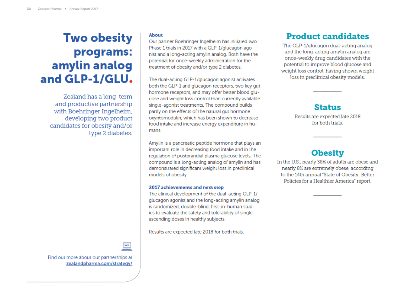 30 Zealand Pharma Annual Report 2017 Two obesity programs: amylin analog and GLP-1/GLU Zealand has a long-term and productive partnership with Boehringer Ingelheim, developing two product candidates for obesity and/or type 2 diabetes. Product candidates The GLP-1/glucagon dual-acting analog and the long-acting amylin analog are once-weekly drug candidates with the potential to improve blood glucose and weight loss control, having shown weight loss in preclinical obesity models. About Our partner Boehringer Ingelheim has initiated two Phase 1 trials in 2017 with a GLP-1/glucagon ago-nist and a long-acting amylin analog. Both have the potential for once-weekly administration for the treatment of obesity and/or type 2 diabetes. The dual-acting GLP-1/glucagon agonist activates both the GLP-1 and glucagon receptors, two key gut hormone receptors, and may offer better blood glu-cose and weight loss control than currently available single-agonist treatments. The compound builds partly on the effects of the natural gut hormone oxyntomodulin, which has been shown to decrease food intake and increase energy expenditure in hu-mans. Status Results are expected late 2018 for both trials. Amylin is a pancreatic peptide hormone that plays an important role in decreasing food intake and in the regulation of postprandial plasma glucose levels. The compound is a long-acting analog of amylin and has demonstrated significant weight loss in preclinical models of obesity. Obesity In the U.S., nearly 38% of adults are obese and nearly 8% are extremely obese, according to the 14th annual State of Obesity: Better Policies for a Healthier America report. 2017 achievements and next step The clinical development of the dual-acting GLP-1/ glucagon agonist and the long-acting amylin analog is randomized, double-blind, first-in-human stud-ies to evaluate the safety and tolerability of single ascending doses in healthy subjects. Results are expected late 2018 for both trials. Find out more about our partnerships at zealandpharma.com/strategy/