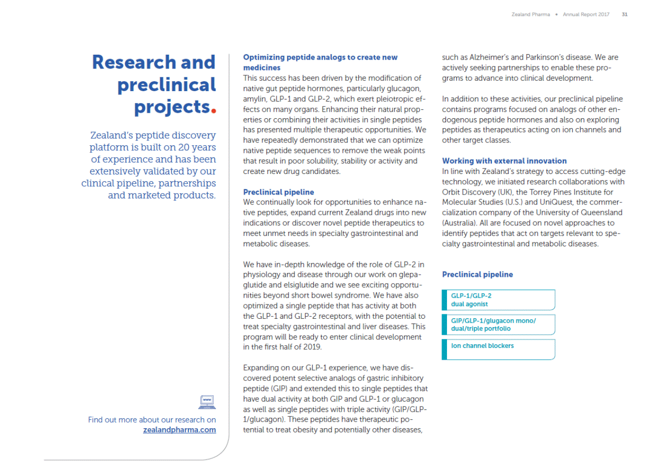 Zealand Pharma Annual Report 2017 31 Research and preclinical projects Zealands peptide discovery platform is built on 20 years of experience and has been extensively validated by our clinical pipeline, partnerships and marketed products. Optimizing peptide analogs to create new medicines This success has been driven by the modification of native gut peptide hormones, particularly glucagon, amylin, GLP-1 and GLP-2, which exert pleiotropic ef-fects on many organs. Enhancing their natural prop-erties or combining their activities in single peptides has presented multiple therapeutic opportunities. We have repeatedly demonstrated that we can optimize native peptide sequences to remove the weak points that result in poor solubility, stability or activity and create new drug candidates. such as Alzheimers and Parkinsons disease. We are actively seeking partnerships to enable these pro-grams to advance into clinical development. In addition to these activities, our preclinical pipeline contains programs focused on analogs of other en-dogenous peptide hormones and also on exploring peptides as therapeutics acting on ion channels and other target classes. Working with external innovation In line with Zealands strategy to access cutting-edge technology, we initiated research collaborations with Orbit Discovery (UK), the Torrey Pines Institute for Molecular Studies (U.S.) and UniQuest, the commer-cialization company of the University of Queensland (Australia). All are focused on novel approaches to identify peptides that act on targets relevant to spe-cialty gastrointestinal and metabolic diseases. Preclinical pipeline We continually look for opportunities to enhance na-tive peptides, expand current Zealand drugs into new indications or discover novel peptide therapeutics to meet unmet needs in specialty gastrointestinal and metabolic diseases. We have in-depth knowledge of the role of GLP-2 in physiology and disease through our work on glepa-glutide and elsiglutide and we see exciting opportu-nities beyond short bowel syndrome. We have also optimized a single peptide that has activity at both the GLP-1 and GLP-2 receptors, with the potential to treat specialty gastrointestinal and liver diseases. This program will be ready to enter clinical development in the first half of 2019. Preclinical pipeline GLP-1/GLP-2 dual agonist GIP/GLP-1/glugacon mono/ dual/triple portfolio Ion channel blockers Expanding on our GLP-1 experience, we have dis-covered potent selective analogs of gastric inhibitory peptide (GIP) and extended this to single peptides that have dual activity at both GIP and GLP-1 or glucagon as well as single peptides with triple activity (GIP/GLP-1/glucagon). These peptides have therapeutic po-tential to treat obesity and potentially other diseases, Find out more about our research on zealandpharma.com