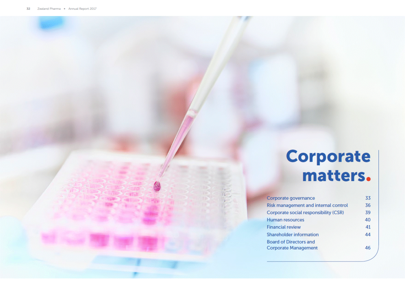 32 Zealand Pharma Annual Report 2017 Corporate matters Corporate governance Risk management and internal control Corporate social responsibility (CSR) Human resources Financial review Shareholder information Board of Directors and Corporate Management 33 36 39 40 41 44 46