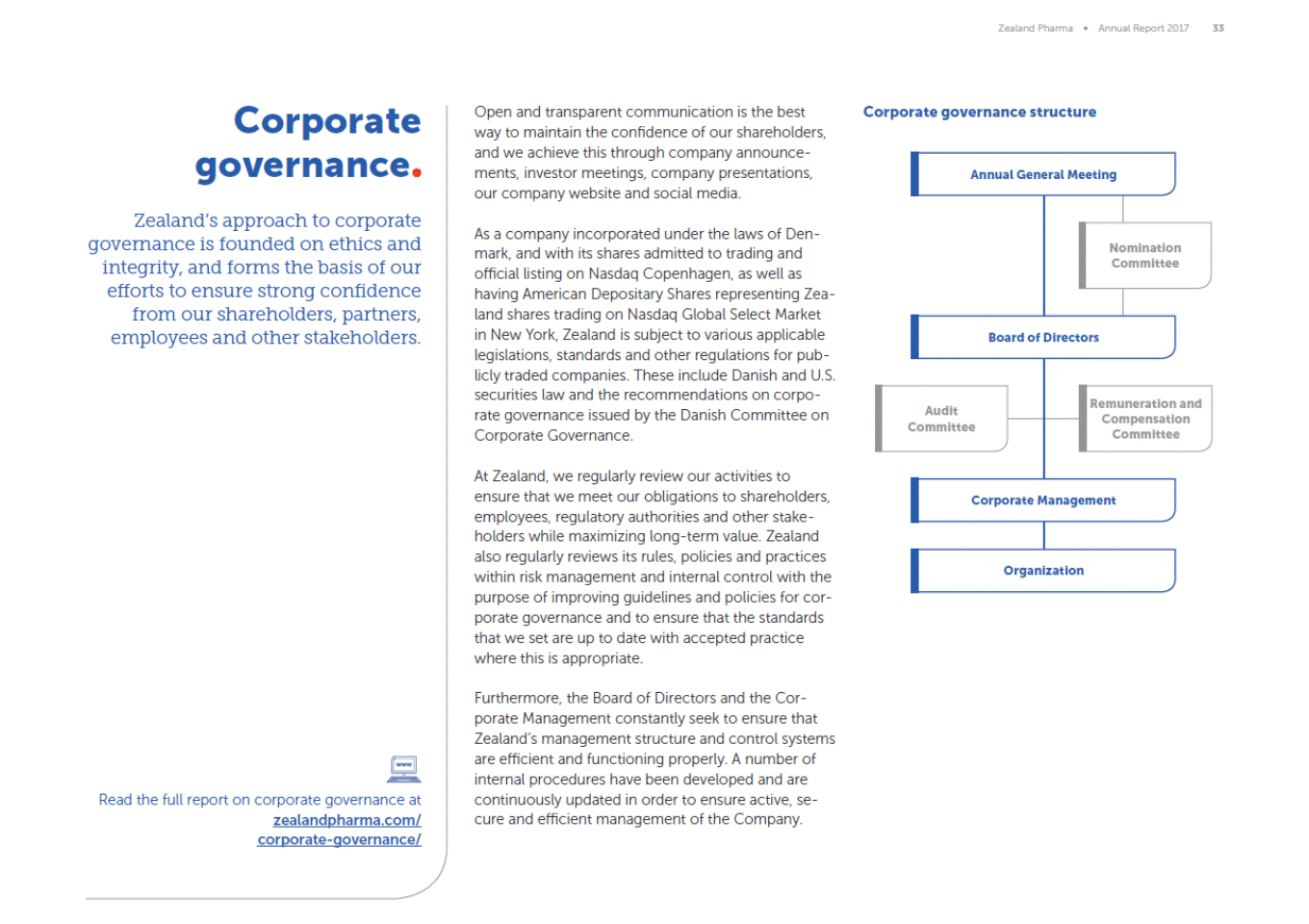 Zealand Pharma Annual Report 2017 33 Corporate governance Zealands approach to corporate governance is founded on ethics and integrity, and forms the basis of our efforts to ensure strong confidence from our shareholders, partners, employees and other stakeholders. Corporate governance structure Open and transparent communication is the best way to maintain the confidence of our shareholders, and we achieve this through company announce-ments, investor meetings, company presentations, our company website and social media. General Meeting As a company incorporated under the laws of Den-mark, and with its shares admitted to trading and official listing on Nasdaq Copenhagen, as well as having American Depositary Shares representing Zea-land shares trading on Nasdaq Global Select Market in New York, Zealand is subject to various applicable legislations, standards and other regulations for pub-licly traded companies. These include Danish and U.S. securities law and the recommendations on corpo-rate governance issued by the Danish Committee on Corporate Governance. Nomination Committee emuneration and Compensation Audit Committee Committee At Zealand, we regularly review our activities to ensure that we meet our obligations to shareholders, employees, regulatory authorities and other stake-holders while maximizing long-term value. Zealand also regularly reviews its rules, policies and practices within risk management and internal control with the purpose of improving guidelines and policies for cor-porate governance and to ensure that the standards that we set are up to date with accepted practice where this is appropriate. Management Furthermore, the Board of Directors and the Cor-porate Management constantly seek to ensure that Zealands management structure and control systems are efficient and functioning properly. A number of internal procedures have been developed and are continuously updated in order to ensure active, se-cure and efficient management of the Company. Read the full report on corporate governance at zealandpharma.com/ corporate-governance/ Annual Board of Directors R Corporate Organi zation