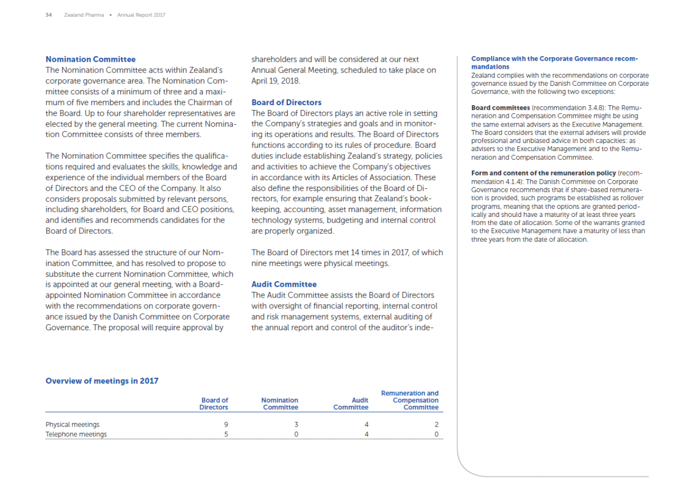 34 Zealand Pharma Annual Report 2017 Compliance with the Corporate Governance recom-mandations Zealand complies with the recommendations on corporate governance issued by the Danish Committee on Corporate Governance, with the following two exceptions: Nomination Committee The Nomination Committee acts within Zealands corporate governance area. The Nomination Com-mittee consists of a minimum of three and a maxi-mum of five members and includes the Chairman of the Board. Up to four shareholder representatives are elected by the general meeting. The current Nomina-tion Committee consists of three members. shareholders and will be considered at our next Annual General Meeting, scheduled to take place on April 19, 2018. Board of Directors The Board of Directors plays an active role in setting the Companys strategies and goals and in monitor-ing its operations and results. The Board of Directors functions according to its rules of procedure. Board duties include establishing Zealands strategy, policies and activities to achieve the Companys objectives in accordance with its Articles of Association. These also define the responsibilities of the Board of Di-rectors, for example ensuring that Zealands book-keeping, accounting, asset management, information technology systems, budgeting and internal control are properly organized. Board committees (recommendation 3.4.8): The Remu-neration and Compensation Committee might be using the same external advisers as the Executive Management. The Board considers that the external advisers will provide professional and unbiased advice in both capacities: as advisers to the Executive Management and to the Remu-neration and Compensation Committee. The Nomination Committee specifies the qualifica-tions required and evaluates the skills, knowledge and experience of the individual members of the Board of Directors and the CEO of the Company. It also considers proposals submitted by relevant persons, including shareholders, for Board and CEO positions, and identifies and recommends candidates for the Board of Directors. Form and content of the remuneration policy (recom-mendation 4.1.4): The Danish Committee on Corporate Governance recommends that if share-based remunera-tion is provided, such programs be established as rollover programs, meaning that the options are granted period-ically and should have a maturity of at least three years from the date of allocation. Some of the warrants granted to the Executive Management have a maturity of less than three years from the date of allocation. The Board of Directors met 14 times in 2017, of which nine meetings were physical meetings. The Board has assessed the structure of our Nom-ination Committee, and has resolved to propose to substitute the current Nomination Committee, which is appointed at our general meeting, with a Board-appointed Nomination Committee in accordance with the recommendations on corporate govern-ance issued by the Danish Committee on Corporate Governance. The proposal will require approval by Audit Committee The Audit Committee assists the Board of Directors with oversight of financial reporting, internal control and risk management systems, external auditing of the annual report and control of the auditors inde-Overview of meetings in 2017 Remuneration and Compensation Committee Board of Directors Nomination Committee Audit Committee Physical meetings Telephone meetings 9 5 3 0 4 4 2 0