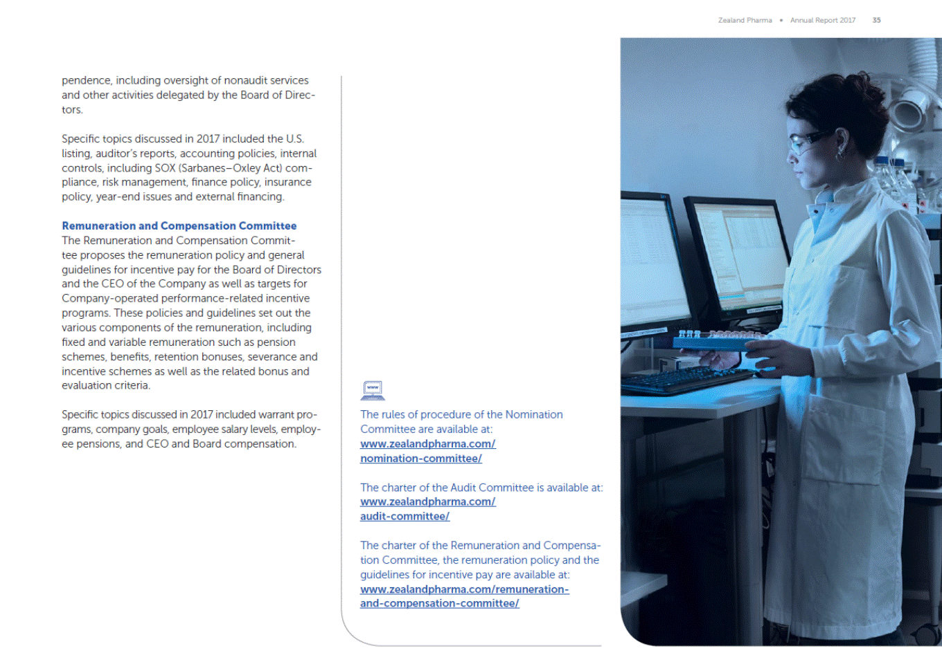 Zealand Pharma Annual Report 2017 35 pendence, including oversight of nonaudit services and other activities delegated by the Board of Direc-tors. Specific topics discussed in 2017 included the U.S. listing, auditors reports, accounting policies, internal controls, including SOX (SarbanesOxley Act) com-pliance, risk management, finance policy, insurance policy, year-end issues and external financing. Remuneration and Compensation Committee The Remuneration and Compensation Commit-tee proposes the remuneration policy and general guidelines for incentive pay for the Board of Directors and the CEO of the Company as well as targets for Company-operated performance-related incentive programs. These policies and guidelines set out the various components of the remuneration, including fixed and variable remuneration such as pension schemes, benefits, retention bonuses, severance and incentive schemes as well as the related bonus and evaluation criteria. Specific topics discussed in 2017 included warrant pro-grams, company goals, employee salary levels, employ-ee pensions, and CEO and Board compensation. The rules of procedure of the Nomination Committee are available at: www.zealandpharma.com/ nomination-committee/ The charter of the Audit Committee is available at: www.zealandpharma.com/ audit-committee/ The charter of the Remuneration and Compensa-tion Committee, the remuneration policy and the guidelines for incentive pay are available at: www.zealandpharma.com/remuneration-and-compensation-committee/