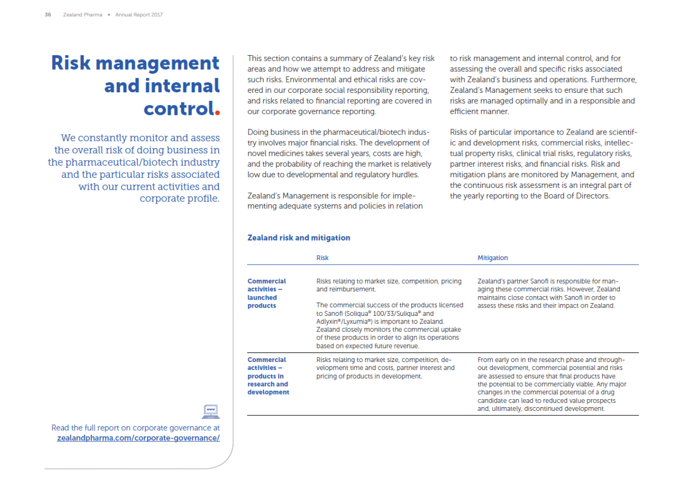 36 Zealand Pharma Annual Report 2017 Risk management and internal control We constantly monitor and assess the overall risk of doing business in the pharmaceutical/biotech industry and the particular risks associated with our current activities and corporate profile. This section contains a summary of Zealands key risk areas and how we attempt to address and mitigate such risks. Environmental and ethical risks are cov-ered in our corporate social responsibility reporting, and risks related to financial reporting are covered in our corporate governance reporting. to risk management and internal control, and for assessing the overall and specific risks associated with Zealands business and operations. Furthermore, Zealands Management seeks to ensure that such risks are managed optimally and in a responsible and efficient manner. Doing business in the pharmaceutical/biotech indus-try involves major financial risks. The development of novel medicines takes several years, costs are high, and the probability of reaching the market is relatively low due to developmental and regulatory hurdles. Risks of particular importance to Zealand are scientif-ic and development risks, commercial risks, intellec-tual property risks, clinical trial risks, regulatory risks, partner interest risks, and financial risks. Risk and mitigation plans are monitored by Management, and the continuous risk assessment is an integral part of the yearly reporting to the Board of Directors. Zealands Management is responsible for imple-menting adequate systems and policies in relation Zealand risk and mitigation Risk Mitigation Commercial activities launched products Risks relating to market size, competition, pricing and reimbursement. Zealands partner Sanofi is responsible for man-aging these commercial risks. However, Zealand maintains close contact with Sanofi in order to assess these risks and their impact on Zealand. The commercial success of the products licensed to Sanofi (Soliqua® 100/33/Suliqua® and Adlyxin®/Lyxumia®) is important to Zealand. Zealand closely monitors the commercial uptake of these products in order to align its operations based on expected future revenue. Commercial activities products in research and development Risks relating to market size, competition, de-velopment time and costs, partner interest and pricing of products in development. From early on in the research phase and through-out development, commercial potential and risks are assessed to ensure that final products have the potential to be commercially viable. Any major changes in the commercial potential of a drug candidate can lead to reduced value prospects and, ultimately, discontinued development. Read the full report on corporate governance at zealandpharma.com/corporate-governance/