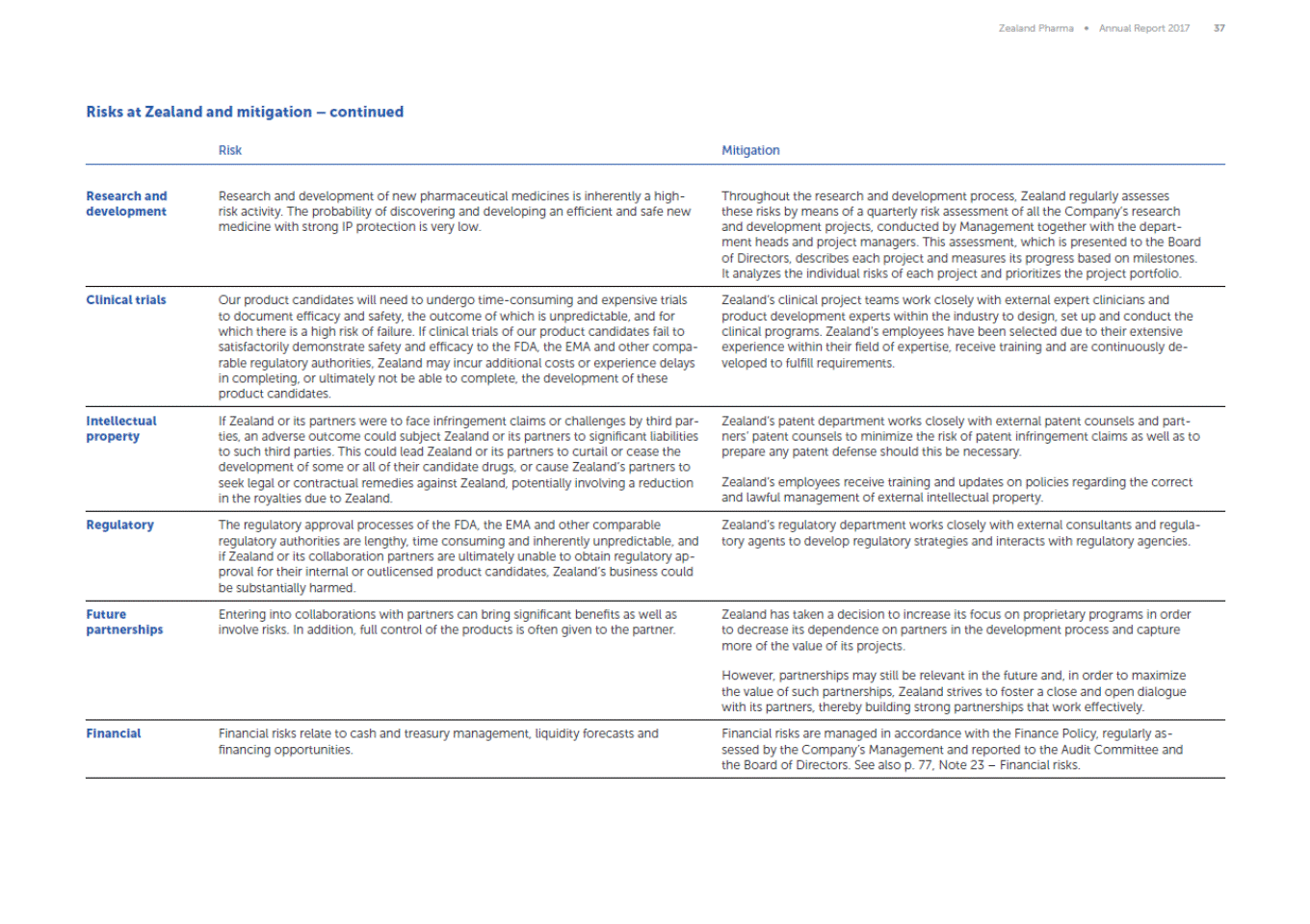 Zealand Pharma Annual Report 2017 37 Risks at Zealand and mitigation continued Risk Mitigation Research and development Research and development of new pharmaceutical medicines is inherently a high-risk activity. The probability of discovering and developing an efficient and safe new medicine with strong IP protection is very low. Throughout the research and development process, Zealand regularly assesses these risks by means of a quarterly risk assessment of all the Companys research and development projects, conducted by Management together with the depart-ment heads and project managers. This assessment, which is presented to the Board of Directors, describes each project and measures its progress based on milestones. It analyzes the individual risks of each project and prioritizes the project portfolio. Clinical trials Our product candidates will need to undergo time-consuming and expensive trials to document efficacy and safety, the outcome of which is unpredictable, and for which there is a high risk of failure. If clinical trials of our product candidates fail to satisfactorily demonstrate safety and efficacy to the FDA, the EMA and other compa-rable regulatory authorities, Zealand may incur additional costs or experience delays in completing, or ultimately not be able to complete, the development of these product candidates. Zealands clinical project teams work closely with external expert clinicians and product development experts within the industry to design, set up and conduct the clinical programs. Zealands employees have been selected due to their extensive experience within their field of expertise, receive training and are continuously de-veloped to fulfill requirements. Intellectual property If Zealand or its partners were to face infringement claims or challenges by third par-ties, an adverse outcome could subject Zealand or its partners to significant liabilities to such third parties. This could lead Zealand or its partners to curtail or cease the development of some or all of their candidate drugs, or cause Zealands partners to seek legal or contractual remedies against Zealand, potentially involving a reduction in the royalties due to Zealand. Zealands patent department works closely with external patent counsels and part-ners patent counsels to minimize the risk of patent infringement claims as well as to prepare any patent defense should this be necessary. Zealands employees receive training and updates on policies regarding the correct and lawful management of external intellectual property. Regulatory The regulatory approval processes of the FDA, the EMA and other comparable regulatory authorities are lengthy, time consuming and inherently unpredictable, and if Zealand or its collaboration partners are ultimately unable to obtain regulatory ap-proval for their internal or outlicensed product candidates, Zealands business could be substantially harmed. Zealands regulatory department works closely with external consultants and regula-tory agents to develop regulatory strategies and interacts with regulatory agencies. Future partnerships Entering into collaborations with partners can bring significant benefits as well as involve risks. In addition, full control of the products is often given to the partner. Zealand has taken a decision to increase its focus on proprietary programs in order to decrease its dependence on partners in the development process and capture more of the value of its projects. However, partnerships may still be relevant in the future and, in order to maximize the value of such partnerships, Zealand strives to foster a close and open dialogue with its partners, thereby building strong partnerships that work effectively. Financial Financial risks relate to cash and treasury management, liquidity forecasts and financing opportunities. Financial risks are managed in accordance with the Finance Policy, regularly as-sessed by the Companys Management and reported to the Audit Committee and the Board of Directors. See also p. 77, Note 23 Financial risks.