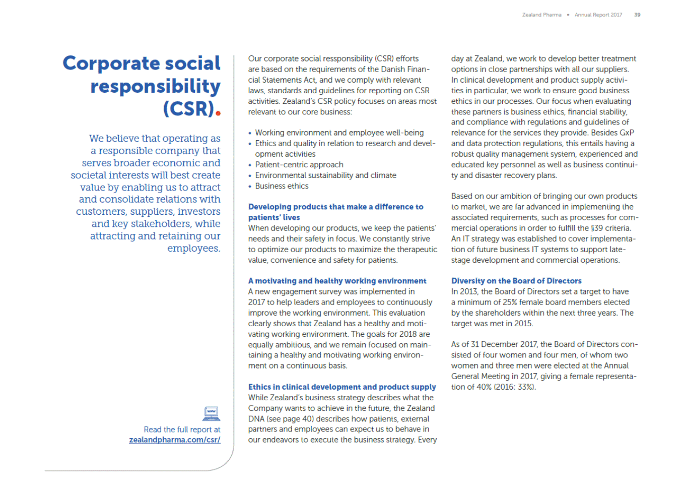 Zealand Pharma Annual Report 2017 39 Corporate social responsibility (CSR) We believe that operating as a responsible company that serves broader economic and societal interests will best create value by enabling us to attract and consolidate relations with customers, suppliers, investors and key stakeholders, while attracting and retaining our employees. Our corporate social ressponsibility (CSR) efforts are based on the requirements of the Danish Finan-cial Statements Act, and we comply with relevant laws, standards and guidelines for reporting on CSR activities. Zealands CSR policy focuses on areas most relevant to our core business: day at Zealand, we work to develop better treatment options in close partnerships with all our suppliers. In clinical development and product supply activi-ties in particular, we work to ensure good business ethics in our processes. Our focus when evaluating these partners is business ethics, financial stability, and compliance with regulations and guidelines of relevance for the services they provide. Besides GxP and data protection regulations, this entails having a robust quality management system, experienced and educated key personnel as well as business continui-ty and disaster recovery plans. Working environment and employee well-being Ethics and quality in relation to research and devel-opment activities Patient-centric approach Environmental sustainability and climate Business ethics Based on our ambition of bringing our own products to market, we are far advanced in implementing the associated requirements, such as processes for com-mercial operations in order to fulfill the §39 criteria. An IT strategy was established to cover implementa-tion of future business IT systems to support late-stage development and commercial operations. Developing products that make a difference to patients lives When developing our products, we keep the patients needs and their safety in focus. We constantly strive to optimize our products to maximize the therapeutic value, convenience and safety for patients. Diversity on the Board of Directors In 2013, the Board of Directors set a target to have a minimum of 25% female board members elected by the shareholders within the next three years. The target was met in 2015. A motivating and healthy working environment A new engagement survey was implemented in 2017 to help leaders and employees to continuously improve the working environment. This evaluation clearly shows that Zealand has a healthy and moti-vating working environment. The goals for 2018 are equally ambitious, and we remain focused on main-taining a healthy and motivating working environ-ment on a continuous basis. As of 31 December 2017, the Board of Directors con-sisted of four women and four men, of whom two women and three men were elected at the Annual General Meeting in 2017, giving a female representa-tion of 40% (2016: 33%). Ethics in clinical development and product supply While Zealands business strategy describes what the Company wants to achieve in the future, the Zealand DNA (see page 40) describes how patients, external partners and employees can expect us to behave in our endeavors to execute the business strategy. Every Read the full report at zealandpharma.com/csr/