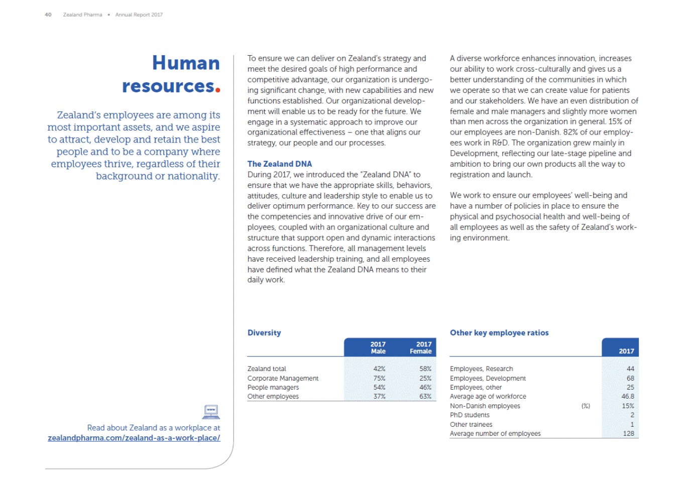 40 Zealand Pharma Annual Report 2017 Human resources Zealands employees are among its most important assets, and we aspire to attract, develop and retain the best people and to be a company where employees thrive, regardless of their background or nationality. To ensure we can deliver on Zealands strategy and meet the desired goals of high performance and competitive advantage, our organization is undergo-ing significant change, with new capabilities and new functions established. Our organizational develop-ment will enable us to be ready for the future. We engage in a systematic approach to improve our organizational effectiveness one that aligns our strategy, our people and our processes. A diverse workforce enhances innovation, increases our ability to work cross-culturally and gives us a better understanding of the communities in which we operate so that we can create value for patients and our stakeholders. We have an even distribution of female and male managers and slightly more women than men across the organization in general. 15% of our employees are non-Danish. 82% of our employ-ees work in R&D. The organization grew mainly in Development, reflecting our late-stage pipeline and ambition to bring our own products all the way to registration and launch. The Zealand DNA During 2017, we introduced the Zealand DNA to ensure that we have the appropriate skills, behaviors, attitudes, culture and leadership style to enable us to deliver optimum performance. Key to our success are the competencies and innovative drive of our em-ployees, coupled with an organizational culture and structure that support open and dynamic interactions across functions. Therefore, all management levels have received leadership training, and all employees have defined what the Zealand DNA means to their daily work. We work to ensure our employees well-being and have a number of policies in place to ensure the physical and psychosocial health and well-being of all employees as well as the safety of Zealands work-ing environment. Diversity Other key employee ratios 2017 Male 2017 Female 2017 Zealand total Corporate Management People managers Other employees 42% 75% 54% 37% 58% 25% 46% 63% Employees, Research Employees, Development Employees, other Average age of workforce Non-Danish employees PhD students Other trainees Average number of employees 44 68 25 46.8 15% 2 1 128 (%) Read about Zealand as a workplace at zealandpharma.com/zealand-as-a-work-place/