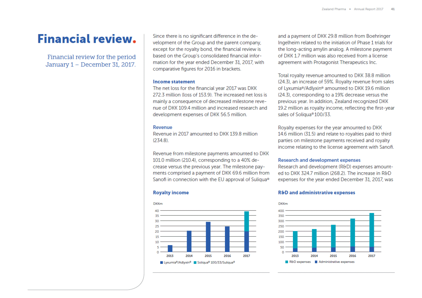 Zealand Pharma Annual Report 2017 41 Financial review Financial review for the period January 1 December 31, 2017. Since there is no significant difference in the de-velopment of the Group and the parent company, except for the royalty bond, the financial review is based on the Groups consolidated financial infor-mation for the year ended December 31, 2017, with comparative figures for 2016 in brackets. and a payment of DKK 29.8 million from Boehringer Ingelheim related to the initiation of Phase 1 trials for the long-acting amylin analog. A milestone payment of DKK 1.7 million was also received from a license agreement with Protagonist Therapeutics Inc. Total royalty revenue amounted to DKK 38.8 million (24.3), an increase of 59%. Royalty revenue from sales of Lyxumia®/Adlyxin® amounted to DKK 19.6 million (24.3), corresponding to a 19% decrease versus the previous year. In addition, Zealand recognized DKK 19.2 million as royalty income, reflecting the first-year sales of Soliqua® 100/33. Income statement The net loss for the financial year 2017 was DKK 272.3 million (loss of 153.9). The increased net loss is mainly a consequence of decreased milestone reve-nue of DKK 109.4 million and increased research and development expenses of DKK 56.5 million. Revenue Revenue in 2017 amounted to DKK 139.8 million (234.8). Royalty expenses for the year amounted to DKK 14.6 million (31.5) and relate to royalties paid to third parties on milestone payments received and royalty income relating to the license agreement with Sanofi. Revenue from milestone payments amounted to DKK 101.0 million (210.4), corresponding to a 40% de-crease versus the previous year. The milestone pay-ments comprised a payment of DKK 69.6 million from Sanofi in connection with the EU approval of Suliqua® Research and development expenses Research and development (R&D) expenses amount-ed to DKK 324.7 million (268.2). The increase in R&D expenses for the year ended December 31, 2017, was Royalty income R&D and administrative expenses DKKm DKKm 40 35 30 25 20 15 10 5 0 400 350 300 250 200 150 100 50 0 2013 2014 2015 2016 2017 2013 R&D expenses 2014 2015 2016 2017 Administrative expenses Lyxumia®/Adlyxin® Soliqua® 100/33/Suliqua®
