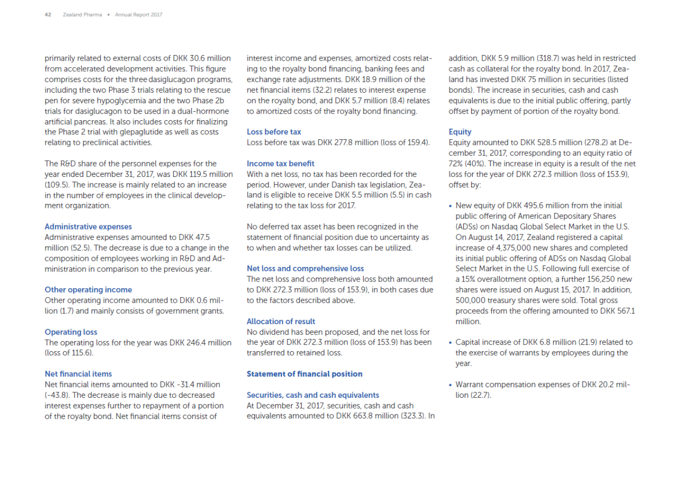 42 Zealand Pharma Annual Report 2017 addition, DKK 5.9 million (318.7) was held in restricted cash as collateral for the royalty bond. In 2017, Zea-land has invested DKK 75 million in securities (listed bonds). The increase in securities, cash and cash equivalents is due to the initial public offering, partly offset by payment of portion of the royalty bond. primarily related to external costs of DKK 30.6 million from accelerated development activities. This figure comprises costs for the three dasiglucagon programs, including the two Phase 3 trials relating to the rescue pen for severe hypoglycemia and the two Phase 2b trials for dasiglucagon to be used in a dual-hormone artificial pancreas. It also includes costs for finalizing the Phase 2 trial with glepaglutide as well as costs relating to preclinical activities. interest income and expenses, amortized costs relat-ing to the royalty bond financing, banking fees and exchange rate adjustments. DKK 18.9 million of the net financial items (32.2) relates to interest expense on the royalty bond, and DKK 5.7 million (8.4) relates to amortized costs of the royalty bond financing. Loss before tax Loss before tax was DKK 277.8 million (loss of 159.4). Equity Equity amounted to DKK 528.5 million (278.2) at De-cember 31, 2017, corresponding to an equity ratio of 72% (40%). The increase in equity is a result of the net loss for the year of DKK 272.3 million (loss of 153.9), offset by: Income tax benefit With a net loss, no tax has been recorded for the period. However, under Danish tax legislation, Zea-land is eligible to receive DKK 5.5 million (5.5) in cash relating to the tax loss for 2017. The R&D share of the personnel expenses for the year ended December 31, 2017, was DKK 119.5 million (109.5). The increase is mainly related to an increase in the number of employees in the clinical develop-ment organization. New equity of DKK 495.6 million from the initial public offering of American Depositary Shares (ADSs) on Nasdaq Global Select Market in the U.S. On August 14, 2017, Zealand registered a capital increase of 4,375,000 new shares and completed its initial public offering of ADSs on Nasdaq Global Select Market in the U.S. Following full exercise of a 15% overallotment option, a further 156,250 new shares were issued on August 15, 2017. In addition, 500,000 treasury shares were sold. Total gross proceeds from the offering amounted to DKK 567.1 million. Administrative expenses Administrative expenses amounted to DKK 47.5 million (52.5). The decrease is due to a change in the composition of employees working in R&D and Ad-ministration in comparison to the previous year. No deferred tax asset has been recognized in the statement of financial position due to uncertainty as to when and whether tax losses can be utilized. Net loss and comprehensive loss The net loss and comprehensive loss both amounted to DKK 272.3 million (loss of 153.9), in both cases due to the factors described above. Other operating income Other operating income amounted to DKK 0.6 mil-lion (1.7) and mainly consists of government grants. Allocation of result No dividend has been proposed, and the net loss for the year of DKK 272.3 million (loss of 153.9) has been transferred to retained loss. Operating loss The operating loss for the year was DKK 246.4 million (loss of 115.6). Capital increase of DKK 6.8 million (21.9) related to the exercise of warrants by employees during the year. Statement of financial position Net financial items Net financial items amounted to DKK -31.4 million (-43.8). The decrease is mainly due to decreased interest expenses further to repayment of a portion of the royalty bond. Net financial items consist of Warrant compensation expenses of DKK 20.2 mil-lion (22.7). Securities, cash and cash equivalents At December 31, 2017, securities, cash and cash equivalents amounted to DKK 663.8 million (323.3). In