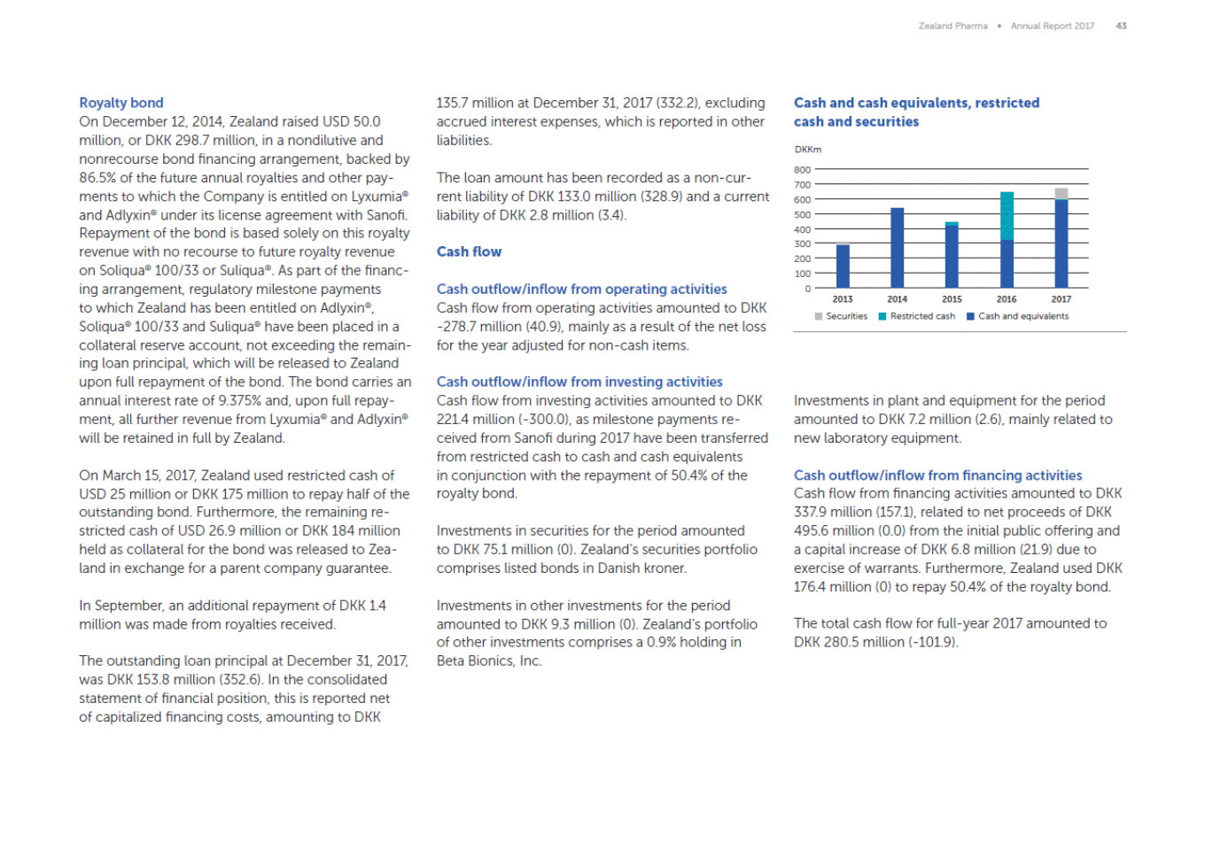 Zealand Pharma Annual Report 2017 43 Royalty bond On December 12, 2014, Zealand raised USD 50.0 million, or DKK 298.7 million, in a nondilutive and nonrecourse bond financing arrangement, backed by 86.5% of the future annual royalties and other pay-ments to which the Company is entitled on Lyxumia® and Adlyxin® under its license agreement with Sanofi. Repayment of the bond is based solely on this royalty revenue with no recourse to future royalty revenue on Soliqua® 100/33 or Suliqua®. As part of the financ-ing arrangement, regulatory milestone payments to which Zealand has been entitled on Adlyxin®, Soliqua® 100/33 and Suliqua® have been placed in a collateral reserve account, not exceeding the remain-ing loan principal, which will be released to Zealand upon full repayment of the bond. The bond carries an annual interest rate of 9.375% and, upon full repay-ment, all further revenue from Lyxumia® and Adlyxin® will be retained in full by Zealand. 135.7 million at December 31, 2017 (332.2), excluding accrued interest expenses, which is reported in other liabilities. Cash and cash equivalents, restricted cash and securities DKKm 800 700 600 500 400 300 200 100 0 The loan amount has been recorded as a non-cur-rent liability of DKK 133.0 million (328.9) and a current liability of DKK 2.8 million (3.4). Cash flow Cash outflow/inflow from operating activities Cash flow from operating activities amounted to DKK -278.7 million (40.9), mainly as a result of the net loss for the year adjusted for non-cash items. 2013 2014 2015 2016 2017 Securities Restricted cash Cash and equivalents Cash outflow/inflow from investing activities Cash flow from investing activities amounted to DKK 221.4 million (-300.0), as milestone payments re-ceived from Sanofi during 2017 have been transferred from restricted cash to cash and cash equivalents in conjunction with the repayment of 50.4% of the royalty bond. Investments in plant and equipment for the period amounted to DKK 7.2 million (2.6), mainly related to new laboratory equipment. On March 15, 2017, Zealand used restricted cash of USD 25 million or DKK 175 million to repay half of the outstanding bond. Furthermore, the remaining re-stricted cash of USD 26.9 million or DKK 184 million held as collateral for the bond was released to Zea-land in exchange for a parent company guarantee. Cash outflow/inflow from financing activities Cash flow from financing activities amounted to DKK 337.9 million (157.1), related to net proceeds of DKK 495.6 million (0.0) from the initial public offering and a capital increase of DKK 6.8 million (21.9) due to exercise of warrants. Furthermore, Zealand used DKK 176.4 million (0) to repay 50.4% of the royalty bond. Investments in securities for the period amounted to DKK 75.1 million (0). Zealands securities portfolio comprises listed bonds in Danish kroner. In September, an additional repayment of DKK 1.4 million was made from royalties received. Investments in other investments for the period amounted to DKK 9.3 million (0). Zealands portfolio of other investments comprises a 0.9% holding in Beta Bionics, Inc. The total cash flow for full-year 2017 amounted to DKK 280.5 million (-101.9). The outstanding loan principal at December 31, 2017, was DKK 153.8 million (352.6). In the consolidated statement of financial position, this is reported net of capitalized financing costs, amounting to DKK