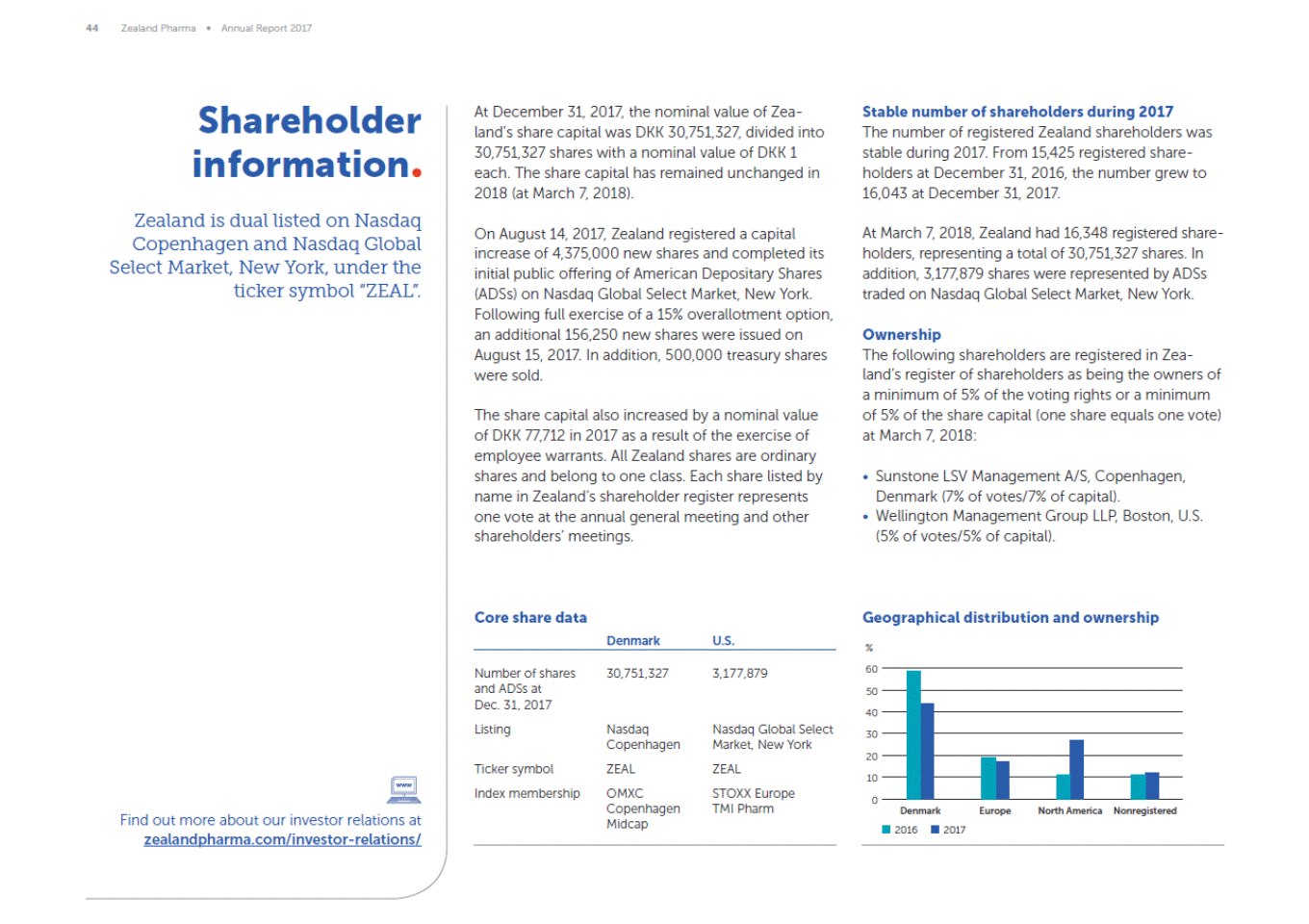 44 Zealand Pharma Annual Report 2017 Shareholder information Zealand is dual listed on Nasdaq Copenhagen and Nasdaq Global Select Market, New York, under the ticker symbol ZEAL. Stable number of shareholders during 2017 The number of registered Zealand shareholders was stable during 2017. From 15,425 registered share-holders at December 31, 2016, the number grew to 16,043 at December 31, 2017. At December 31, 2017, the nominal value of Zea-lands share capital was DKK 30,751,327, divided into 30,751,327 shares with a nominal value of DKK 1 each. The share capital has remained unchanged in 2018 (at March 7, 2018). On August 14, 2017, Zealand registered a capital increase of 4,375,000 new shares and completed its initial public offering of American Depositary Shares (ADSs) on Nasdaq Global Select Market, New York. Following full exercise of a 15% overallotment option, an additional 156,250 new shares were issued on August 15, 2017. In addition, 500,000 treasury shares were sold. At March 7, 2018, Zealand had 16,348 registered share-holders, representing a total of 30,751,327 shares. In addition, 3,177,879 shares were represented by ADSs traded on Nasdaq Global Select Market, New York. Ownership The following shareholders are registered in Zea-lands register of shareholders as being the owners of a minimum of 5% of the voting rights or a minimum of 5% of the share capital (one share equals one vote) at March 7, 2018: The share capital also increased by a nominal value of DKK 77,712 in 2017 as a result of the exercise of employee warrants. All Zealand shares are ordinary shares and belong to one class. Each share listed by name in Zealands shareholder register represents one vote at the annual general meeting and other shareholders meetings. Sunstone LSV Management A/S, Copenhagen, Denmark (7% of votes/7% of capital). Wellington Management Group LLP, Boston, U.S. (5% of votes/5% of capital). Core share data Denmark Geographical distribution and ownership U.S. % 60 Number of shares and ADSs at Dec. 31, 2017 Listing 30,751,327 3,177,879 50 40 Nasdaq Copenhagen ZEAL OMXC Copenhagen Midcap Nasdaq Global Select Market, New York ZEAL STOXX Europe TMI Pharm 30 20 Ticker symbol Index membership 10 0 Denmark Europe North America Nonregistered Find out more about our investor relations at zealandpharma.com/investor-relations/ 2016 2017