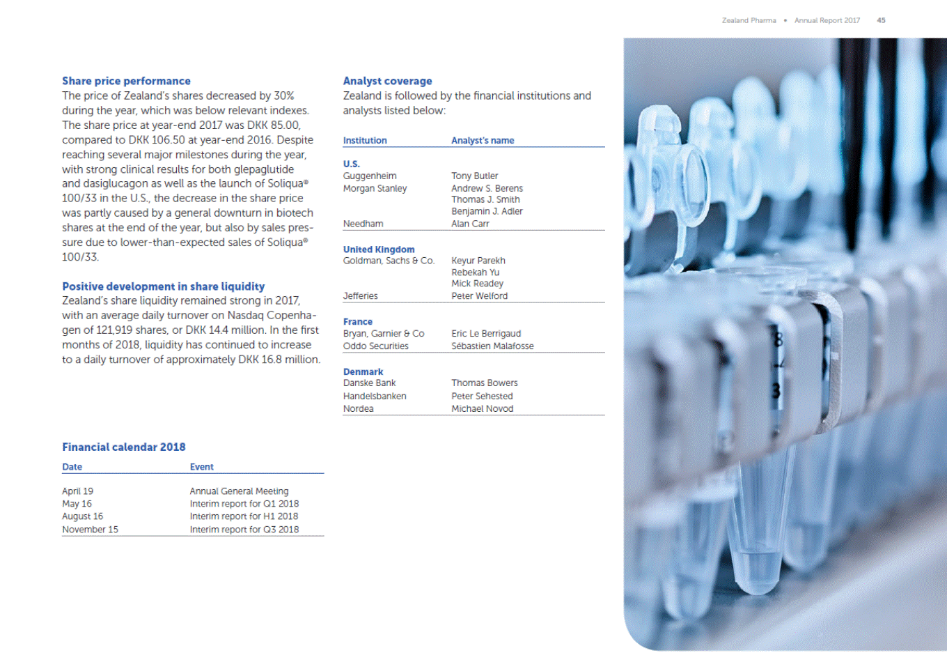 Zealand Pharma Annual Report 2017 45 Share price performance The price of Zealands shares decreased by 30% during the year, which was below relevant indexes. The share price at year-end 2017 was DKK 85.00, compared to DKK 106.50 at year-end 2016. Despite reaching several major milestones during the year, with strong clinical results for both glepaglutide and dasiglucagon as well as the launch of Soliqua® 100/33 in the U.S., the decrease in the share price was partly caused by a general downturn in biotech shares at the end of the year, but also by sales pres-sure due to lower-than-expected sales of Soliqua® 100/33. Analyst coverage Zealand is followed by the financial institutions and analysts listed below: Institution Analysts name U.S. Guggenheim Morgan Stanley Tony Butler Andrew S. Berens Thomas J. Smith Benjamin J. Adler Alan Carr Needham United Kingdom Goldman, Sachs & Co. Keyur Parekh Rebekah Yu Mick Readey Peter Welford Positive development in share liquidity Zealands share liquidity remained strong in 2017, with an average daily turnover on Nasdaq Copenha-gen of 121,919 shares, or DKK 14.4 million. In the first months of 2018, liquidity has continued to increase to a daily turnover of approximately DKK 16.8 million. Jefferies France Bryan, Garnier & Co Oddo Securities Eric Le Berrigaud Sébastien Malafosse Denmark Danske Bank Handelsbanken Nordea Thomas Bowers Peter Sehested Michael Novod Financial calendar 2018 Date Event April 19 May 16 August 16 November 15 Annual General Meeting Interim report for Q1 2018 Interim report for H1 2018 Interim report for Q3 2018