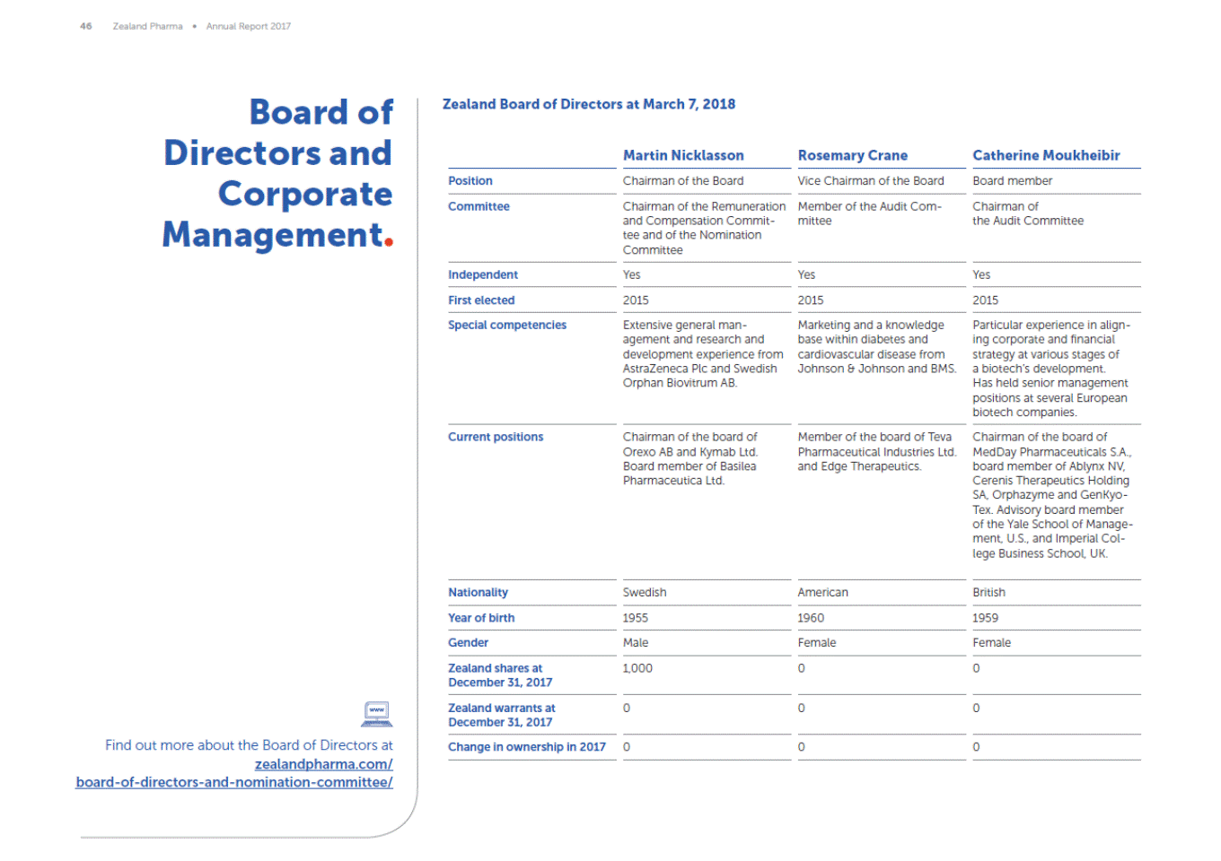 46 Zealand Pharma Annual Report 2017 Board of Directors and Corporate Management Zealand Board of Directors at March 7, 2018 Martin Nicklasson Rosemary Crane Catherine Moukheibir Position Chairman of the Board Vice Chairman of the Board Board member Committee Chairman of the Remuneration and Compensation Commit-tee and of the Nomination Committee Member of the Audit Com-mittee Chairman of the Audit Committee Independent Yes Yes Yes First elected 2015 2015 2015 Special competencies Extensive general man-agement and research and development experience from AstraZeneca Plc and Swedish Orphan Biovitrum AB. Marketing and a knowledge base within diabetes and cardiovascular disease from Johnson & Johnson and BMS. Particular experience in align-ing corporate and financial strategy at various stages of a biotechs development. Has held senior management positions at several European biotech companies. Current positions Chairman of the board of Orexo AB and Kymab Ltd. Board member of Basilea Pharmaceutica Ltd. Member of the board of Teva Pharmaceutical Industries Ltd. and Edge Therapeutics. Chairman of the board of MedDay Pharmaceuticals S.A., board member of Ablynx NV, Cerenis Therapeutics Holding SA, Orphazyme and GenKyo-Tex. Advisory board member of the Yale School of Manage-ment, U.S., and Imperial Col-lege Business School, UK. Nationality Swedish American British Year of birth 1955 1960 1959 Gender Male Female Female Zealand shares at December 31, 2017 1,000 0 0 Zealand warrants at December 31, 2017 0 0 0 Find out more about the Board of Directors at zealandpharma.com/ board-of-directors-and-nomination-committee/ Change in ownership in 2017 0 0 0