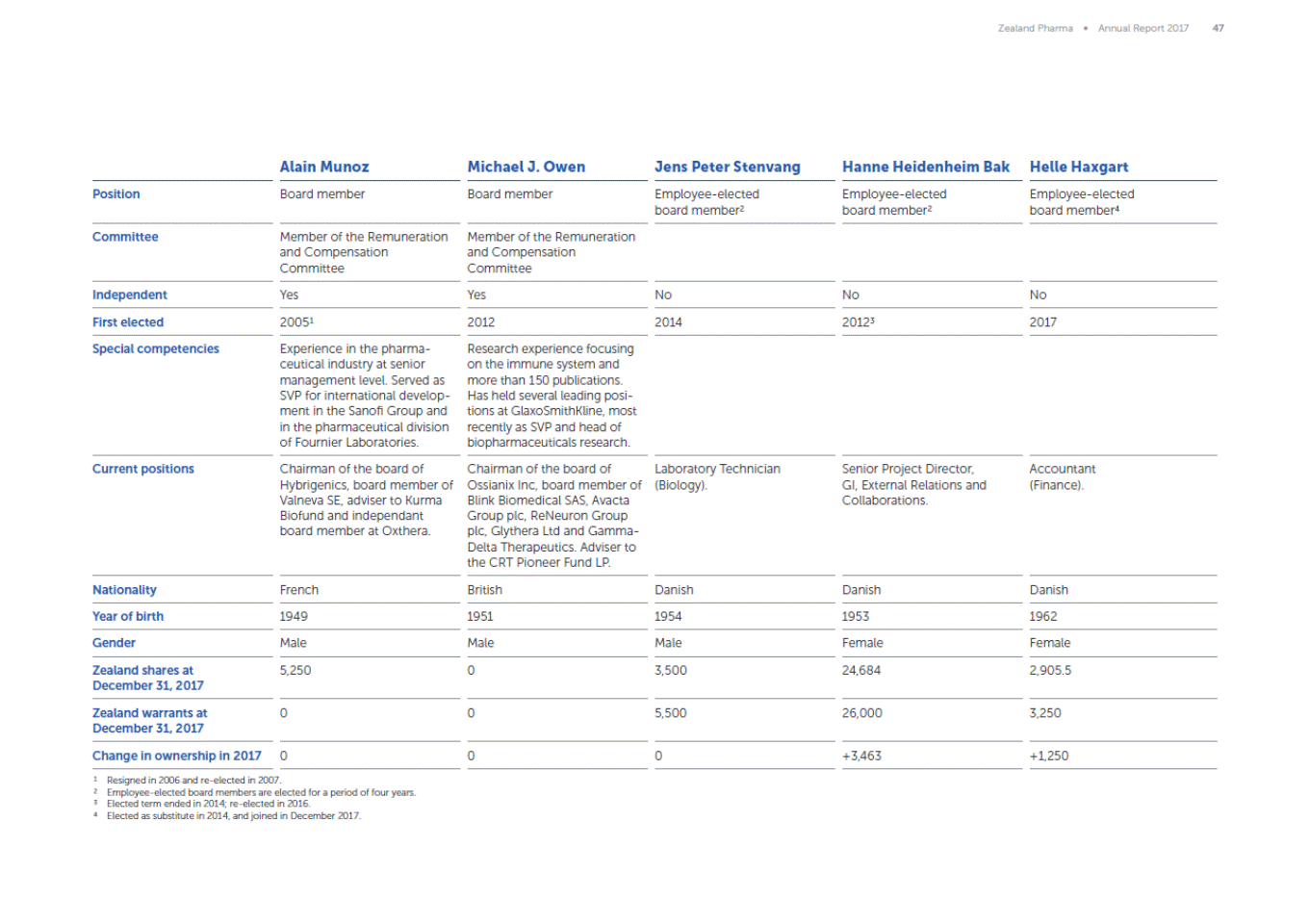 47 h" .1 Alain Munoz MichaelJ. Owen Jens Peter Stenvang Hanne Heidenheim Bak Helle Haxgart Position Board member Board member Employee-elected board member2 Employee-elected board member2 Employee-elected board member Committee Member of the Remuneration and Compensation Committee Member of the Remuneration and Compensation Committee Independent Yes Yes No No No 2017 First elected 20051 Experience in the pharma-ceuticalindustry at senior management leveL Served as SVP for internationaldevelop-ment 1n the Sanofi Group and in the pharmaceuticaldivision of Fournier Laboratories. 2012 Research experience focusing on the immune system and more than 150 publications. Has held severalleading posi-tions at GlaxoSmithKline. most recently as SVP and head of biopharmaceuticals research. 2014 20123 Special competencies Chairman of the board of Hybrigenics. board member of Valneva SE.adviser to Kurma Biofund and independant board member at Oxthera. Chairman of the board of Ossianix Inc. board member of Blink BiomedicalSAS. Avacta Group pic. ReNeuron Group plc. Glythera ltd and Gamma-Delta Therapeutics. Adviser to the CRT Pioneer Fund LP. British Current positions Laboratory Technician (Biology). Senior Project Director. Gl. ExternalRelations and Collaborations. Accountant (Finance). Nationality French Danish Danish 1953 Danish 1962 1949 1951 1954 Year of birth Gender Male 5.250 Male 0 Ma.e 3.500 Female 24.684 Female Zealand shares at December 31, 2017 2.905.5 Zealand warrants at December 31, 2017 0 0 5.500 26.000 3.250 Change in ownership in 2017 0 0 0 +3.463 +1.250 I ReSigned 1n 2006 and re-elected 1n 2007 1 ' Employee-elected board members are elected for a penod of four years Elected term ended 1n 2014 re-eel c ted 1n 2016 Elected as substnute 10 2014 and JOined 1n December 2017