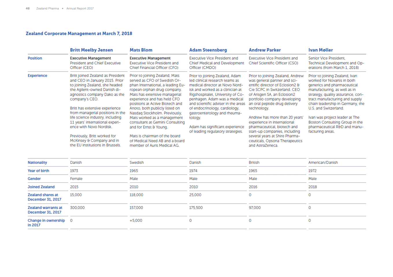 48 Zealand Pharma Annual Report 2017 Zealand Corporate Management at March 7, 2018 Britt Meelby Jensen Mats Blom Adam Steensberg Andrew Parker Ivan Møller Position Executive Management President and Chief Executive Officer (CEO) Executive Management Executive Vice President and Chief Financial Officer (CFO) Executive Vice President and Chief Medical and Development Officer (CMDO) Executive Vice President and Chief Scientific Officer (CSO) Senior Vice President, Technical Development and Op-erations (from March 1, 2018) Experience Britt joined Zealand as President and CEO in January 2015. Prior to joining Zealand, she headed the Agilent-owned Danish di-agnostics company Dako as the companys CEO. Prior to joining Zealand, Mats served as CFO of Swedish Or-phan International, a leading Eu-ropean orphan drug company. Mats has extensive managerial experience and has held CFO positions at Active Biotech and Anoto, both publicly listed on Nasdaq Stockholm. Previously, Mats worked as a management consultant at Gemini Consulting and for Ernst & Young. Prior to joining Zealand, Adam led clinical research teams as medical director at Novo Nord-isk and worked as a clinician at Rigshospitalet, University of Co-penhagen. Adam was a medical and scientific adviser in the areas of endocrinology, cardiology, gastroenterology and rheuma-tology. Prior to joining Zealand, Andrew was general partner and sci-entific director of Eclosion2 & Cie SCPC in Switzerland. CEO of Arisgen SA, an Eclosion2 portfolio company developing an oral peptide drug delivery technology. Prior to joining Zealand, Ivan worked for Novartis in both generics and pharmaceutical manufacturing, as well as in strategy, quality assurance, con-tract manufacturing and supply chain leadership in Germany, the U.S. and Switzerland. Britt has extensive experience from managerial positions in the life science industry, including 11 years international experi-ence with Novo Nordisk. Andrew has more than 20 years experience in international pharmaceutical, biotech and start-up companies, including several years at Shire Pharma-ceuticals, Opsona Therapeutics and AstraZeneca. Ivan was project leader at The Boston Consulting Group in the pharmaceutical R&D and manu-facturing areas. Adam has significant experience of leading regulatory strategies. Previously, Britt worked for McKinsey & Company and in the EU institutions in Brussels. Mats is chairman of the board of Medical Need AB and a board member of Auris Medical AG. Nationality Danish Swedish Danish British American/Danish Year of birth 1973 1965 1974 1965 1972 Gender Female Male Male Male Male Joined Zealand 2015 2010 2010 2016 2018 Zealand shares at December 31, 2017 15,000 118,000 25,000 0 0 Zealand warrants at December 31, 2017 300,000 157,000 175,500 97,000 0 Change in ownership in 2017 0 +5,000 0 0 0