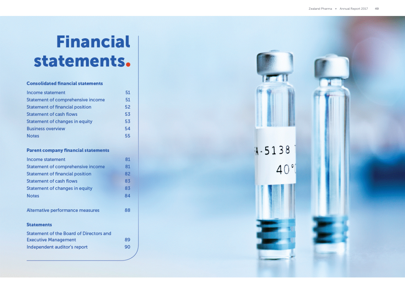 "" Financial statements. Consolidated financial statements Income statement Statement of comprehensive income Statement of financialposition Statement of cash flows Statement of changes in equity Business overview Notes 51 51 52 53 53 54 55 '·5138 . 40° Parent company financial statements Income statement Statement of comprehensive income Statement of financialposition Statement of cash flows Statement of changes in equity Notes 81 81 82 83 83 84 Alternative performance measures 88 Statements Statement of the Board of Directors and Executive Management Independent auditor's report 89 90