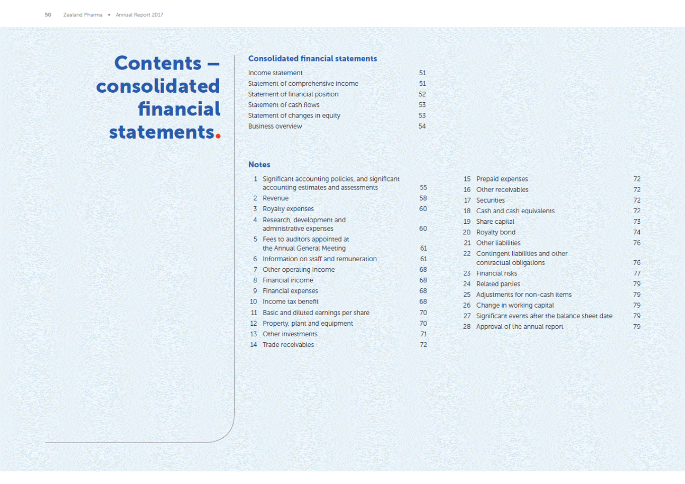 50 Zealand Pharma Annual Report 2017 Contents consolidated financial statements Consolidated financial statements Income statement Statement of comprehensive income Statement of financial position Statement of cash flows Statement of changes in equity Business overview 51 51 52 53 53 54 Notes 1 Significant accounting policies, and significant accounting estimates and assessments Revenue Royalty expenses Research, development and administrative expenses Fees to auditors appointed at the Annual General Meeting Information on staff and remuneration Other operating income Financial income Financial expenses Income tax benefit Basic and diluted earnings per share Property, plant and equipment Other investments Trade receivables 15 16 17 18 19 20 21 22 Prepaid expenses Other receivables Securities Cash and cash equivalents Share capital Royalty bond Other liabilities Contingent liabilities and other contractual obligations Financial risks Related parties Adjustments for non-cash items Change in working capital Significant events after the balance sheet date Approval of the annual report 72 72 72 72 73 74 76 55 58 60 2 3 4 60 5 61 61 68 68 68 68 70 70 71 72 6 7 8 9 10 11 12 13 14 76 77 79 79 79 79 79 23 24 25 26 27 28