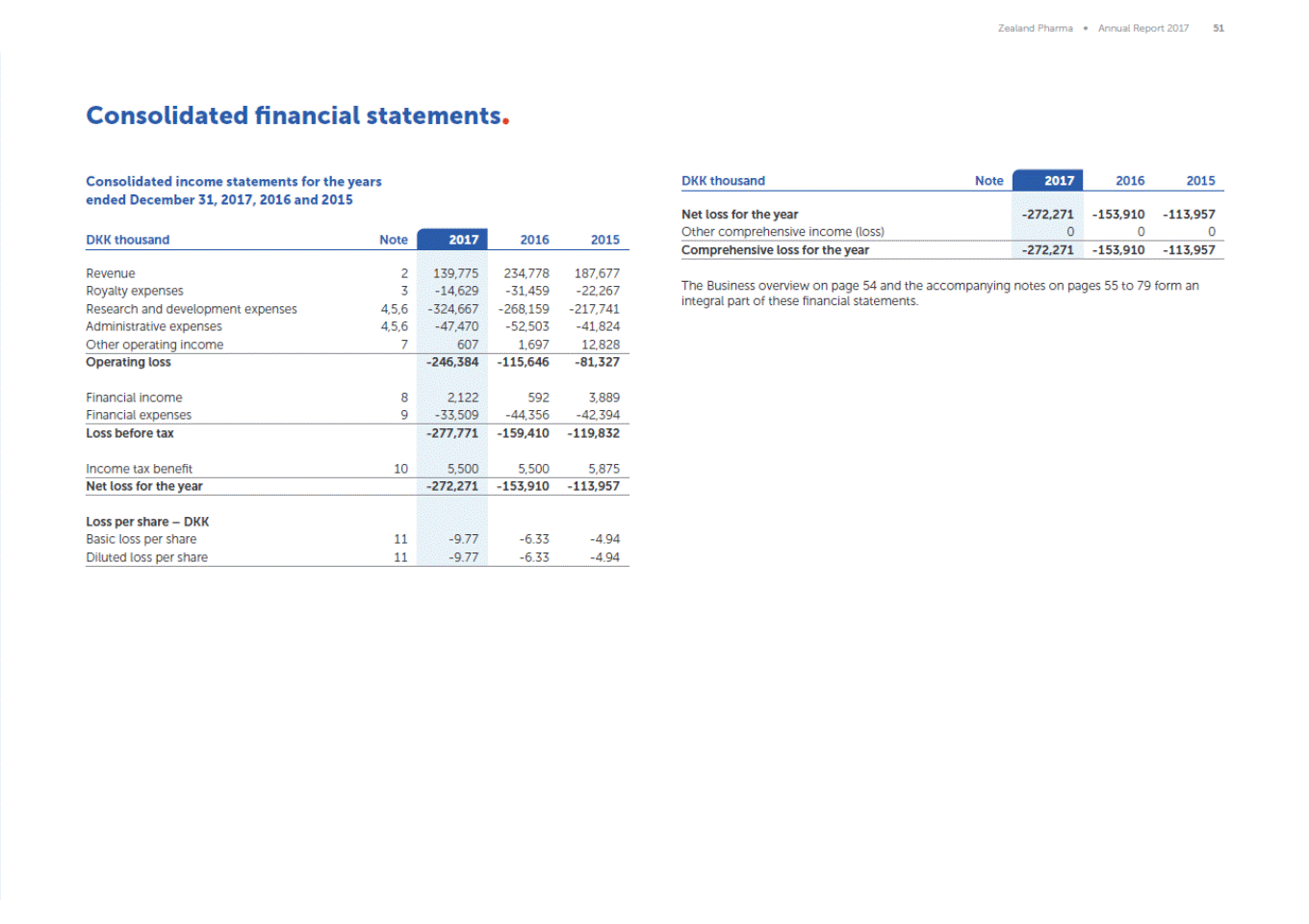 Zealand Pharma Annual Report 2017 51 Consolidated financial statements Consolidated income statements for the years ended December 31, 2017, 2016 and 2015 DKK thousand Note 2017 2016 2015 2017 DKK thousand Note 2016 2015 The Business overview on page 54 and the accompanying notes on pages 55 to 79 form an integral part of these financial statements. Revenue2 Royalty expenses3 Research and development expenses4,5,6 Administrative expenses4,5,6 Other operating income 7 139,775 -14,629 -324,667 -47,470 607 234,778187,677 -31,459 -22,267 -268,159 -217,741 -52,503 -41,824 1,69712,828 Operating loss Financial income 8 Financial expenses9 -246,384 2,122 -33,509 -115,646 -81,327 592 3,889 -44,356 -42,394 Loss before tax Income tax benefit 10 -277,771 5,500 -159,410 -119,832 5,5005,875 Net loss for the year -272,271 -153,910 -113,957 Loss per share DKK Basic loss per share11 Diluted loss per share11 -9.77 -9.77 -6.33 -4.94 -6.33 -4.94 Net loss for the year Other comprehensive income (loss) -272,271 0 -153,910 -113,957 0 0 Comprehensive loss for the year -272,271 -153,910 -113,957