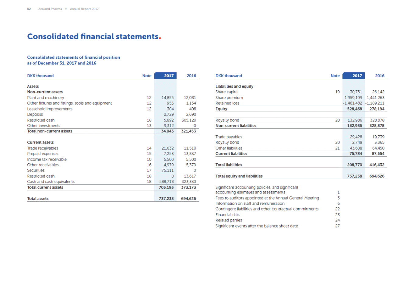 52 Zealand Pharma Annual Report 2017 Consolidated financial statements Consolidated statements of financial position as of December 31, 2017 and 2016 2017 2017 DKK thousand Note 2016 DKK thousand Note 2016 Significant accounting policies, and significant accounting estimates and assessments Fees to auditors appointed at the Annual General Meeting Information on staff and remuneration Contingent liabilities and other contractual commitments Financial risks Related parties Significant events after the balance sheet date 1 5 6 22 23 24 27 Liabilities and equity Share capital 19 Share premium Retained loss 30,751 1,959,199 -1,461,482 26,142 1,441,263 -1,189,211 Equity 528,468 278,194 Royalty bond 20 132,986 328,878 Non-current liabilities 132,986 328,878 Trade payables Royalty bond 20 Other liabilities 21 29,428 2,748 43,608 19,739 3,365 64,450 Current liabilities 75,784 87,554 Total liabilities 208,770 416,432 Total equity and liabilities 737,238 694,626 Assets Non-current assets Plant and machinery 12 Other fixtures and fittings, tools and equipment 12 Leasehold improvements 12 Deposits Restricted cash18 Other investments 13 14,855 953 304 2,729 5,892 9,312 12,081 1,154 408 2,690 305,120 0 Total non-current assets 34,045 321,453 Current assets Trade receivables 14 Prepaid expenses15 Income tax receivable 10 Other receivables 16 Securities17 Restricted cash18 Cash and cash equivalents 18 21,632 7,253 5,500 4,979 75,111 0 588,718 11,510 13,837 5,500 5,379 0 13,617 323,330 Total current assets 703,193 373,173 Total assets 737,238 694,626