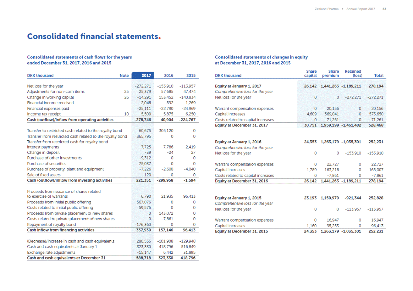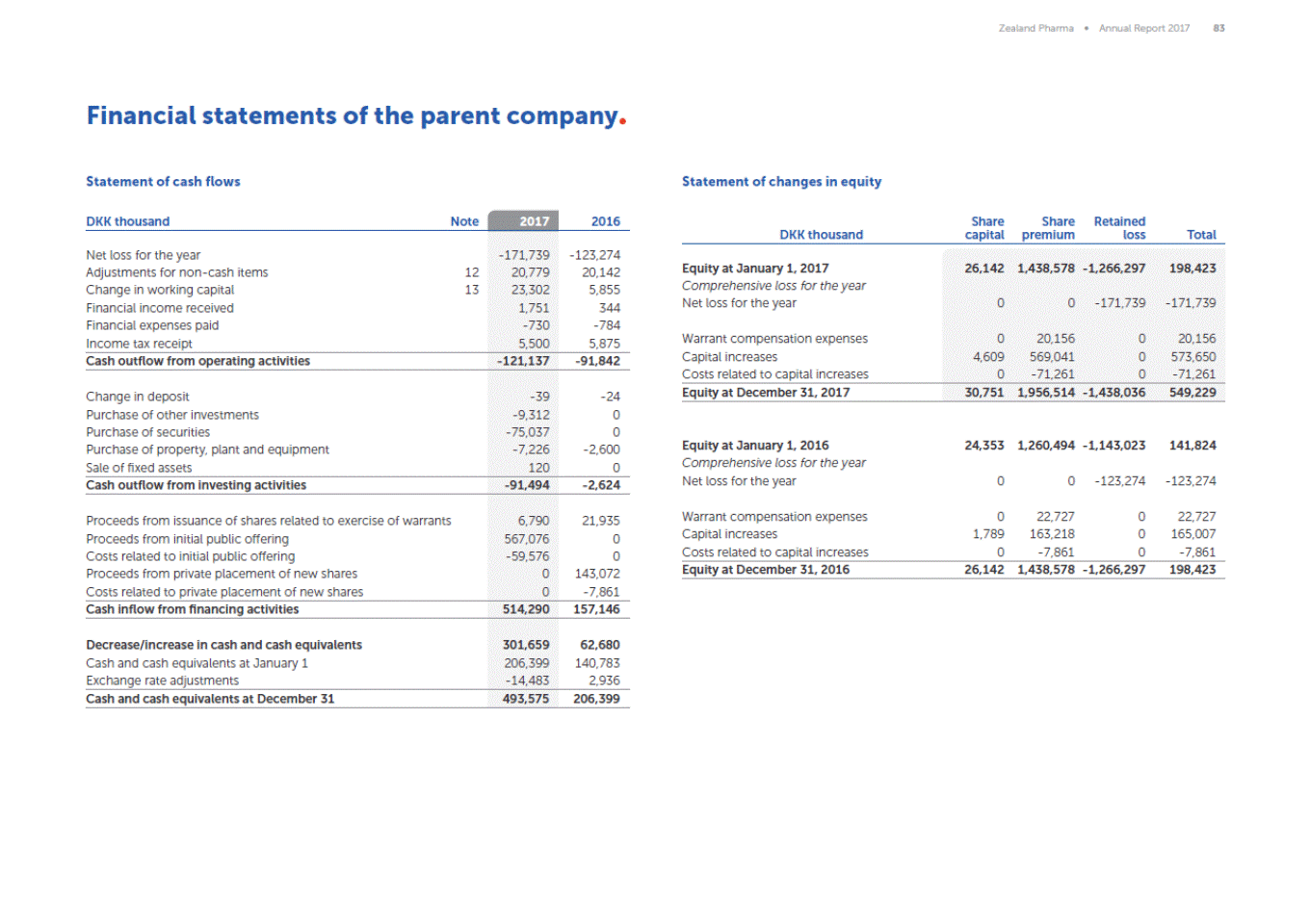 Zealand Pharma Annual Report 2017 83 Financial statements of the parent company Statement of cash flows Statement of changes in equity 2017 DKK thousand Note 2016 Share capital Share premium Retained loss DKK thousand Total Net loss for the year Adjustments for non-cash items Change in working capital Financial income received Financial expenses paid Income tax receipt -171,739 20,363 23,302 2,167 -730 5,500 -123,274 20,142 5,855 344 -784 5,875 Equity at January 1, 2017 Comprehensive loss for the year Net loss for the year 26,142 1,438,578 -1,266,297 198,423 12 13 0 0 -171,739 -171,739 Warrant compensation expenses Capital increases Costs related to capital increases 0 4,609 0 20,156 569,041 -71,261 0 0 0 20,156 573,650 -71,261 Cash outflow from operating activities -121,137 -91,842 Equity at December 31, 2017 30,751 1,956,514 -1,438,036 549,229 Change in deposit Purchase of other investments Purchase of securities Purchase of property, plant and equipment Sale of fixed assets -39 -9,312 -75,037 -7,226 120 -24 0 0 -2,600 0 Equity at January 1, 2016 Comprehensive loss for the year Net loss for the year 24,353 1,260,494 -1,143,023 141,824 0 0 -123,274 -123,274 Cash outflow from investing activities -91,494 -2,624 Warrant compensation expenses Capital increases Costs related to capital increases 0 1,789 0 22,727 163,218 -7,861 0 0 0 22,727 165,007 -7,861 Proceeds from issuance of shares related to exercise of warrants Proceeds from initial public offering Costs related to initial public offering Proceeds from private placement of new shares Costs related to private placement of new shares 6,790 567,076 -59,576 0 0 21,935 0 0 143,072 -7,861 Equity at December 31, 2016 26,142 1,438,578 -1,266,297 198,423 Cash inflow from financing activities 514,290 157,146 Decrease/increase in cash and cash equivalents Cash and cash equivalents at January 1 Exchange rate adjustments 301,659 206,399 -14,483 62,680 140,783 2,936 Cash and cash equivalents at December 31 493,575 206,399
