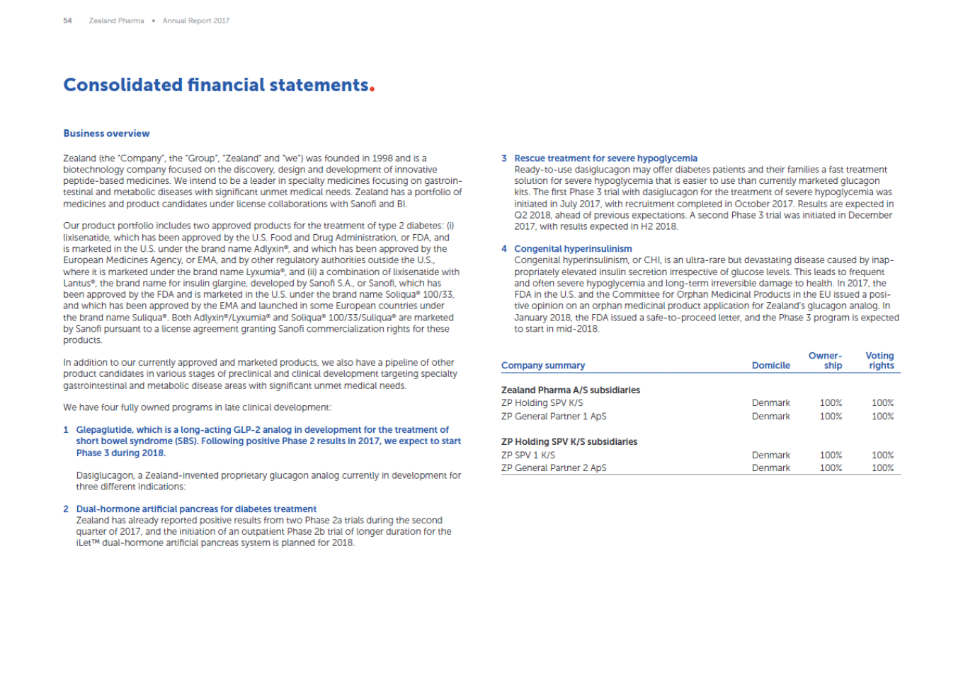 :;J Consolidated financialstatements. Business overview Zealand (the ·company·. the "Group·.·zealand·and ·we") was founded 1n 1998 and IS a biotechnology company focused on the discovery.design and development of innovative peptide-based medicines. We intend to be a leader in specialty medicines focusing on gastroin testinal and metaboliC d1seases w1th s1gn1flcant unmet med1calneeds. Zealand has a portfoliO of med1c1nes and product candidates under l1cense collaborations with Sanofl and Bl. 3 Rescue treatment for severe hypogyl cemia Ready-to-use dastglucagon may offer dtabetes pat1ents and therr famtltes a fast treatment solution for severe hypoglycemia that is easier to use than currently marketed glucagon ktts.The first Phase 3 trialw1th dasiglucagon for the treatment of severe hypoglycemia was 1n1 tiated 1n July 2017. with recruitment completed in October 2017.Results are expected in 02 2018. ahead of prev1ous expectations. A second Phase 3 tnalwas rn1t1ated 1n December 2017.w1th results expected rn H2 2018. Our product portfolio 1ncul des two approved products for the treatment of type 2 d1abetes: (i) lixisenatide. which has been approved by the U.S. Food and Drug Administration. or FDA. and is marketed in the U.S. under the brand name Adlyxin"'. and which has been approved by the European Medicines Agency, or EMA. and by other regulatory authorities outside the U.S.. where it is marketed under the brand name Lyxumia". and (ii) a combination of lixisenatide with Lantus. the brand name for msul1n glarg1ne. developed by Sanoli S.A.. or Sanofl.whrch has been approved by the FDA and is marketed in the U.S. under the brand name Soliqua" 100/33. and which has been approved by the EMA and launched in some European countries under the brand name Suliqua". Both Adlyxin"'/Lyxumia"' and Soliqua" 100/33/Sullqua"' are marketed by Sanofl pursuant to a license agreement grant1ng Sanofi commerc1alizatron nghts for these products. 4 Congenitalhyperinsulinism Congenitalhyperinsulinism. or CHI. is an ultra-rare but devastating disease caused by inap propriately elevated insulin secretion irrespective of glucose levels. This leads to frequent and often severe hypoglycemra and long-term rrrevers1bel damage to health.In 2017. the FDA in the U.S.and the Committee for Orphan Medicinal Products in the EU issued a posi tive opinion on an orphan medicinalproduct application for Zealand's glucagon analog. In January 2018. the FDA 1ssued a safe-to-proceed letter.and the Phase 3 program rs expected to start 1n mtd-2018. Owner-ship Voting rights In addition to our currently approved and marketed products. we also have a pipeline of other product candidates in various stages of preclinical and clinical development targeting specialty gastrorntest1nal and metaboliC d1sease areas wtth srgniflcant unmet med1cal needs. Company summary Domicile Zealand Pharma A /S subsidiaries ZP Holding SPV K/S ZP General Partner 1Ap$ Denmark Denmark 100% 100% 100% 100% We have four fully owned programs in late clinicaldevelopment: 1 Glepagul tide, which is a long-acting GLP-2 analog tn development for the treatment of short bowelsyndrome (SBS). Following positive Phase 2 results in 2017, we expect to start Phase 3 during 2018. ZP Holding SPV K/S subsidiaries ZP SPV 1K/S ZP GeneralPartner 2 ApS Denmark Denmark 100% 100% 100% 100% Dasiglucagon. a Zealand-invented proprietary glucagon analog currently in development for three dtfferent 1nd1cat1ons. 2 Dual-hormone artificialpancreas for diabetes treatment Zealand has already reported postttve results from two Phase 2a tr1als dur1ng the second quarter of 2017. and the 1n1t1at1on of an outpatient Phase 2b trialof longer durat1on for the tletr" dual-hormone artificialpancreas system IS planned for 2018.