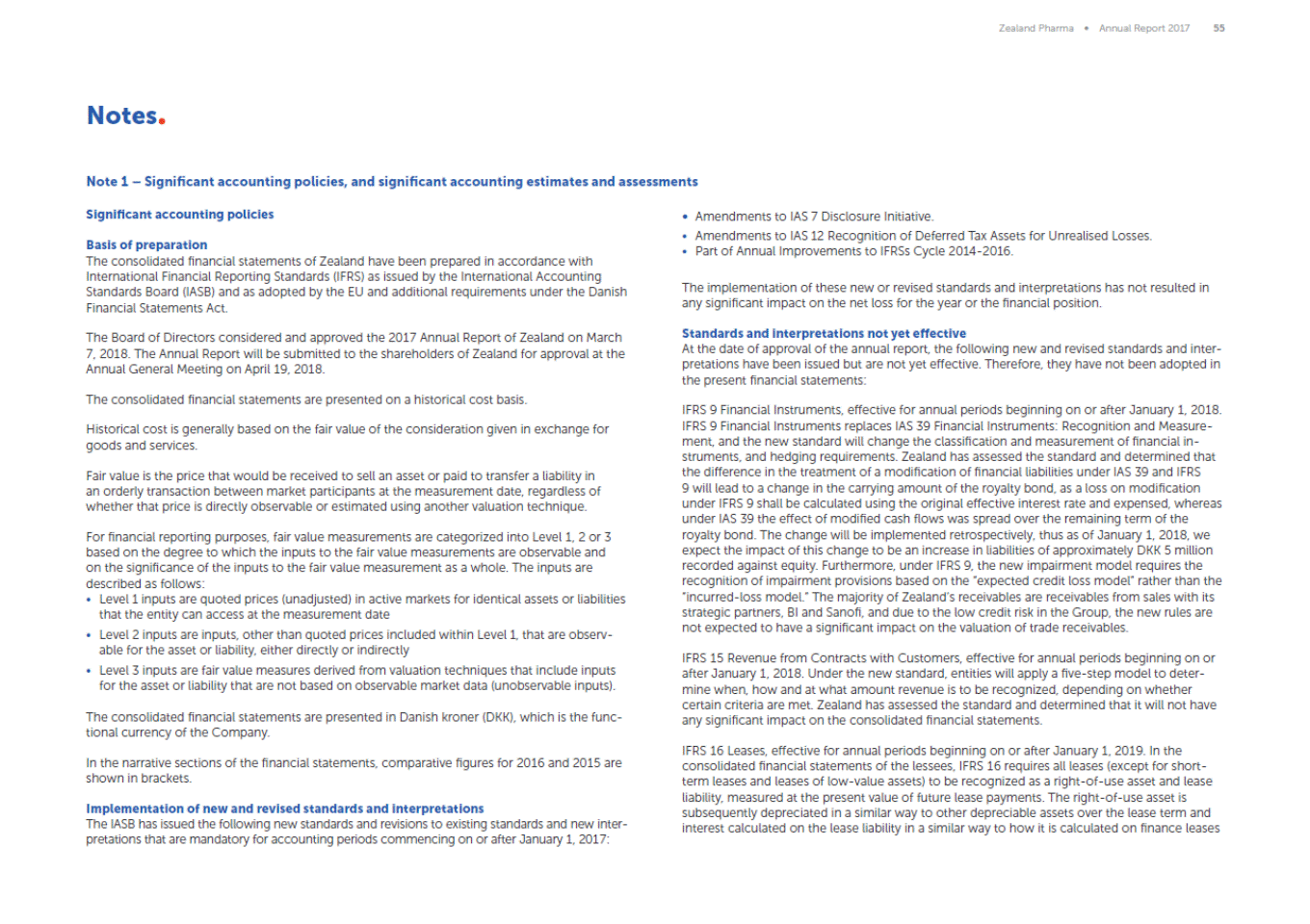 ,. jr-55 Notes. Note 1-Significant accounting policies,and significant accounting estimates and assessments Significant accounting policies Amendments to lAS 7 Disclosure Initiative. Amendments to lAS 12 Recognition of Deferred Tax Assets for Unrealised losses. Part of Annual improvements to IFRSs Cycle 2014-2016. Basis of preparation The consohdated nnanc1alstatements of Zealand have been prepared 1n accordance w1th International Financial Reporting Standards (!FRS) as issued by the InternationalAccounting Standards Board (IASB) and as adopted by the EU and additionalrequirements under the Danish FinancialStatements Act. The implementation of these new or revised standards and interpretations has not resulted in any S1gn1ficant 1mpact on the net loss for the year or the financ1alpos1t1on. Standards and interpretations not yet eHective At the date of approval of the annualreport, the following new and revised standards and inter pretations have been 1ssued but are not yet effective. Therefore. they have not been adopted in the present financ1alstatements· The Board of D1rectors cons1dered and approved the 2017 Annual Report of Zealand on March 7. 2018. The Annual Report will be submitted to the shareholders of Zealand for approvalat the Annual General Meet1ng on Apnl19. 2018. The consolidated fmanc1al statements are presented on a h1stoncalcost bas1s. \FRS 9 F1nanc1allnstruments. effect1ve for annualpenods beg1nn1ng on or after January 1. 2018 \ FR S 9 Financ1al\nstruments replaces lAS 39 Financial instruments:Recognition and Measure ment, and the new standard w1ll change the class1flcatlon and measurement of financ1al1n struments. and hedging requirements. Zealand has assessed the standard and determined that the d1fference 1n the treatment of a mod1ficat1on of nnanc1alllabillties under \AS 39 and \FRS 9 Will lead to a change in the carry1ng amount of the royalty bond, as a loss on modification under \FRS 9 shall be calculated us1ng the ong1nal effect1ve 1nterest rate and expensed. whereas under lAS 39 the effect of modified cash flows was spread over the rema1mng term of the royalty bond. The change w1ll be Implemented retrospectively, thus as of January 1. 2018.we expect the 1mpact of th1s change to be an 1ncrease 1n liab1lit1es of approximately DKK 5 m1ll1on recorded aga1nst equ1ty. Furthermore. under \FRS 9. the new 1mpa1rment model requ1res the recognition of impairment provisions based on the·expected credit loss model" rather than the "incurred-loss model." The majority of Zealand's r eceivables are receivables from sales with its strategiC partners. Bl and Sanofi. and due to the low credit risk m the Group, the new rules are not expected to have a s1gnincant 1mpact on the valuat1on of trade rece1vables. Historicalcost is generally based on the fair value of the consideration given in exchange for goods and services Fair value is the price that would be received to sell an asset or paid to transfer a liability in an orderly transaction between market participants at the measurement date, regardless of whether that price is directly observable or estimated using another valuation technique. For nnanc1alreport1ng purposes. fa1r value measurements are categonzed 1nto Level1. 2 or 3 based on the degree to which the inputs to the fair value measurements are observable and on the S1gn1flcance of the 1nputs to the fa1r value measurement as a whole. The 1nputs are described as follows: Levelilnputs are quoted prices (unadjusted) in active markets for identicalassets or liabilities that the entity can access at the measurement date Level 2 inputs are 1nputs, other than quoted prices included within Levell. that are observ able for the asset or liability, either directly or indirectly Level 3 inputs are fair value measures derived from valuation techniques that include inputs for the asset or liability that are not based on observable market data (unobservable inputs). \FRS 15 Revenue from Contracts wtth Customer s. effecttve for annualpenods beg1nn1ng on or after January 1. 2018. Under the new standard. ent1ttes wtll apply a five -step model to deter mine when.how and at what amount revenue is to be recognized. depending on whether certain criteria are met. Zealand has assessed the standard and determined that it will not have any stgntficant 1mpact on the consolidated financialstatements. The consolidated nnanc1alstatements are presented m Dan1sh kroner (DKK), wh1ch IS the func tionalcurrency of the Company. \FRS 16 Leases. effect1ve for annualperiods beg1nntng on or after January 1, 2019.In the consolidated financial statements of the lessees. \FRS 16 requ1res all leases (except for short term leases and leases of low-value assets) to be recognized as a right-of-use asset and lease liability.measured at the pr esent value of future lease payments. The right -of -use asset is subsequently depreciated in a similar way to other depreciable assets over the lease term and nterest calculated on the lease llab1l1ty tn a stm1lar way to how tt ts calculated on finance leases In the narrat1ve sect1ons of the financialstatements. comparat1ve figures for 2016 and 2015 are shown in brackets. Implementation of new and revised standards and interpretations The IASB has issued the following new standards and revisions to existing standards and new inter pretations that are mandatory for account1ng penods commenc1ng on or after January 1. 2017: