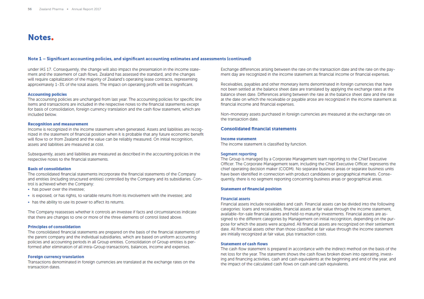 56 Zealand Pharma Annual Report 2017 Notes Note 1 Significant accounting policies, and significant accounting estimates and assessments (continued) under IAS 17. Consequently, the change will also impact the presentation in the income state-ment and the statement of cash flows. Zealand has assessed the standard, and the changes will require capitalization of the majority of Zealands operating lease contracts, representing approximately 1-3% of the total assets. The impact on operating profit will be insignificant. Exchange differences arising between the rate on the transaction date and the rate on the pay-ment day are recognized in the income statement as financial income or financial expenses. Receivables, payables and other monetary items denominated in foreign currencies that have not been settled at the balance sheet date are translated by applying the exchange rates at the balance sheet date. Differences arising between the rate at the balance sheet date and the rate at the date on which the receivable or payable arose are recognized in the income statement as financial income and financial expenses. Accounting policies The accounting policies are unchanged from last year. The accounting policies for specific line items and transactions are included in the respective notes to the financial statements except for basis of consolidation, foreign currency translation and the cash flow statement, which are included below. Non-monetary assets purchased in foreign currencies are measured at the exchange rate on the transaction date. Recognition and measurement Income is recognized in the income statement when generated. Assets and liabilities are recog-nized in the statement of financial position when it is probable that any future economic benefit will flow to or from Zealand and the value can be reliably measured. On initial recognition, assets and liabilities are measured at cost. Consolidated financial statements Income statement The income statement is classified by function. Subsequently, assets and liabilities are measured as described in the accounting policies in the respective notes to the financial statements. Segment reporting The Group is managed by a Corporate Management team reporting to the Chief Executive Officer. The Corporate Management team, including the Chief Executive Officer, represents the chief operating decision maker (CODM). No separate business areas or separate business units have been identified in connection with product candidates or geographical markets. Conse-quently, there is no segment reporting concerning business areas or geographical areas. Basis of consolidation The consolidated financial statements incorporate the financial statements of the Company and entities (including structured entities) controlled by the Company and its subsidiaries. Con-trol is achieved when the Company: Statement of financial position has power over the investee; is exposed, or has rights, to variable returns from its involvement with the investee; and has the ability to use its power to affect its returns. Financial assets Financial assets include receivables and cash. Financial assets can be divided into the following categories: loans and receivables, financial assets at fair value through the income statement, available-for-sale financial assets and held-to maturity investments. Financial assets are as-signed to the different categories by Management on initial recognition, depending on the pur-pose for which the assets were acquired. All financial assets are recognized on their settlement date. All financial assets other than those classified at fair value through the income statement are initially recognized at fair value, plus transaction costs. The Company reassesses whether it controls an investee if facts and circumstances indicate that there are changes to one or more of the three elements of control listed above. Principles of consolidation The consolidated financial statements are prepared on the basis of the financial statements of the parent company and the individual subsidiaries, which are based on uniform accounting policies and accounting periods in all Group entities. Consolidation of Group entities is per-formed after elimination of all intra-Group transactions, balances, income and expenses. Statement of cash flows The cash flow statement is prepared in accordance with the indirect method on the basis of the net loss for the year. The statement shows the cash flows broken down into operating, invest-ing and financing activities, cash and cash equivalents at the beginning and end of the year, and the impact of the calculated cash flows on cash and cash equivalents. Foreign currency translation Transactions denominated in foreign currencies are translated at the exchange rates on the transaction dates.