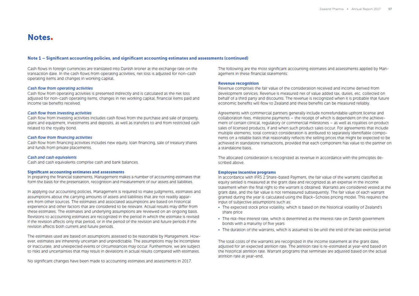 Zealand Pharma Annual Report 2017 57 Notes Note 1 Significant accounting policies, and significant accounting estimates and assessments (continued) Cash flows in foreign currencies are translated into Danish kroner at the exchange rate on the transaction date. In the cash flows from operating activities, net loss is adjusted for non-cash operating items and changes in working capital. The following are the most significant accounting estimates and assessments applied by Man-agement in these financial statements: Revenue recognition Revenue comprises the fair value of the consideration received and income derived from development services. Revenue is measured net of value added tax, duties, etc. collected on behalf of a third party and discounts. The revenue is recognized when it is probable that future economic benefits will flow to Zealand and these benefits can be measured reliably. Cash flow from operating activities Cash flow from operating activities is presented indirectly and is calculated as the net loss adjusted for non-cash operating items, changes in net working capital, financial items paid and income tax benefits received. Cash flow from investing activities Cash flow from investing activities includes cash flows from the purchase and sale of property, plant and equipment, investments and deposits, as well as transfers to and from restricted cash related to the royalty bond. Agreements with commercial partners generally include nonrefundable upfront license and collaboration fees, milestone payments the receipt of which is dependent on the achieve-ment of certain clinical, regulatory or commercial milestones as well as royalties on product sales of licensed products, if and when such product sales occur. For agreements that include multiple elements, total contract consideration is attributed to separately identifiable compo-nents on a reliable basis that reasonably reflects the selling prices that might be expected to be achieved in standalone transactions, provided that each component has value to the partner on a standalone basis. Cash flow from financing activities Cash flow from financing activities includes new equity, loan financing, sale of treasury shares and funds from private placements. Cash and cash equivalents Cash and cash equivalents comprise cash and bank balances. The allocated consideration is recognized as revenue in accordance with the principles de-scribed above. Significant accounting estimates and assessments In preparing the financial statements, Management makes a number of accounting estimates that form the basis for the presentation, recognition and measurement of our assets and liabilities. Employee incentive programs In accordance with IFRS 2 Share-based Payment, the fair value of the warrants classified as equity settled is measured at the grant date and recognized as an expense in the income statement when the final right to the warrant is obtained. Warrants are considered vested at the grant date, and the fair value is not remeasured subsequently. The fair value of each warrant granted during the year is calculated using the BlackScholes pricing model. This requires the input of subjective assumptions such as: In applying our accounting policies, Management is required to make judgments, estimates and assumptions about the carrying amounts of assets and liabilities that are not readily appar-ent from other sources. The estimates and associated assumptions are based on historical experience and other factors that are considered to be relevant. Actual results may differ from these estimates. The estimates and underlying assumptions are reviewed on an ongoing basis. Revisions to accounting estimates are recognized in the period in which the estimate is revised if the revision affects only that period, or in the period of the revision and future periods if the revision affects both current and future periods. The expected stock price volatility, which is based on the historical volatility of Zealands share price The risk-free interest rate, which is determined as the interest rate on Danish government bonds with a maturity of five years The duration of the warrants, which is assumed to be until the end of the last exercise period The estimates used are based on assumptions assessed to be reasonable by Management. How-ever, estimates are inherently uncertain and unpredictable. The assumptions may be incomplete or inaccurate, and unexpected events or circumstances may occur. Furthermore, we are subject to risks and uncertainties that may result in deviations in actual results compared with estimates. The total costs of the warrants are recognized in the income statement at the grant date, adjusted for an expected attrition rate. The attrition rate is re-estimated at year-end based on the historical attrition rate. Warrant programs that terminate are adjusted based on the actual attrition rate at year-end. No significant changes have been made to accounting estimates and assessments in 2017.